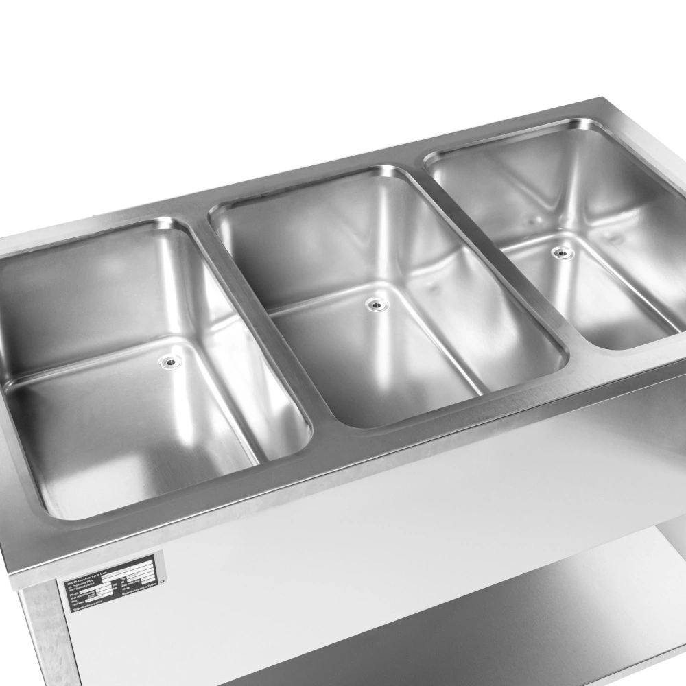 Urządzenie wyposażone jest w trzy niezależne komory przystosowane do pojemników GN 1/1 o głębokości do 20 cm. Dzięki specjalnym listwom wspornikowym można również stosować mniejsze pojemniki GN, co pozwala elastycznie dopasować się do menu oraz liczby serwowanych dań. Każda komora posiada własne sterowanie, dzięki czemu można podgrzewać tylko wybrane sekcje, oszczędzając energię. Bemar wyposażony jest także w wygodny zawór spustowy umożliwiający szybkie opróżnianie wody oraz regulowane stopki, które ułatwiają wypoziomowanie na każdej powierzchni roboczej.