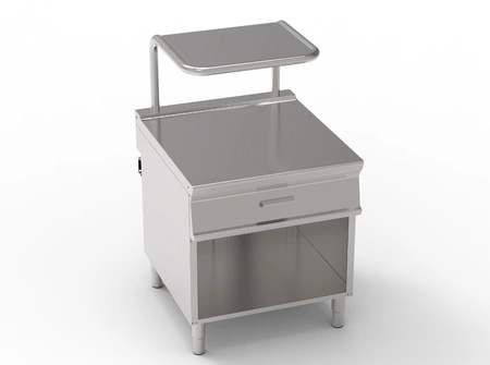 Pojemna szuflada pozwala na przechowywanie niezbędnych akcesoriów, a półka została zaprojektowana specjalnie z myślą o urządzeniach typu salamander, co podnosi funkcjonalność całego stanowiska. Solidna konstrukcja i wysokiej jakości materiały gwarantują trwałość oraz łatwość utrzymania czystości nawet przy intensywnym użytkowaniu.