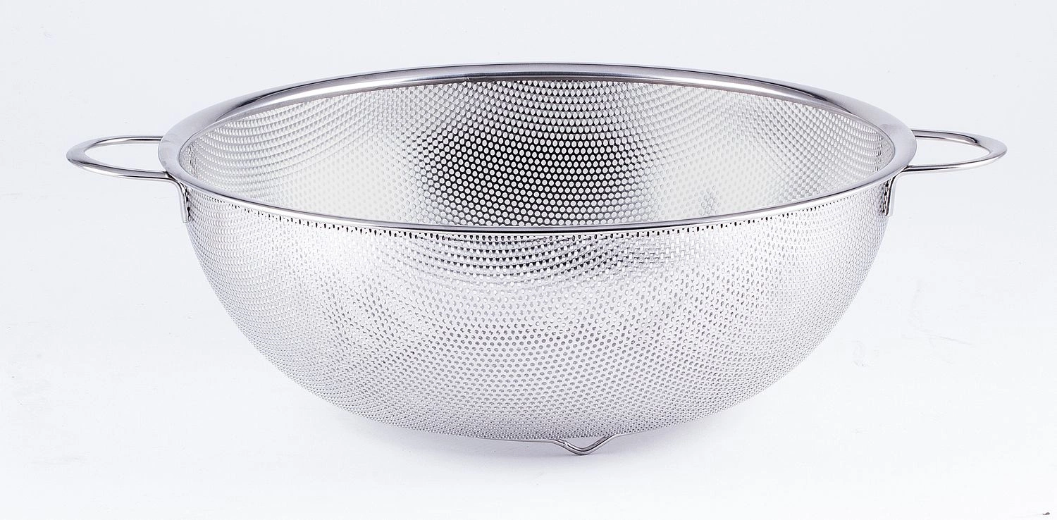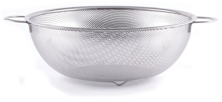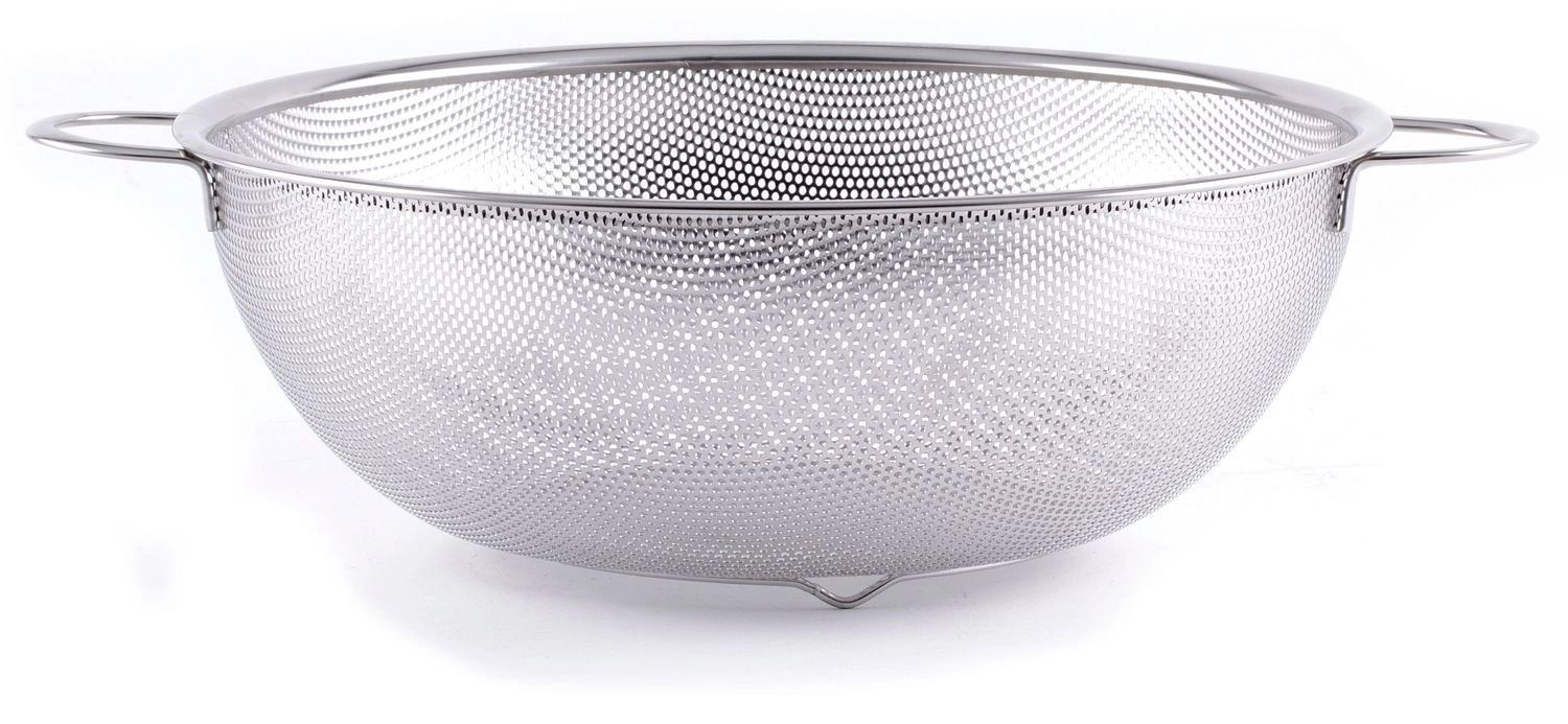 Cedzak o średnicy 31,5 cm z 2 uchwytami i podstawą. Wykonany ze stali nierdzewnej. Można myć w zmywarce.