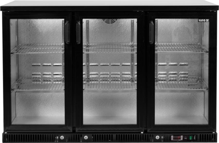 Chłodziarka przeszklona z drzwiami skrzydłowymi do przechowywania i eksponowania butelek. Pojemność całkowita 341 l . Obudowa wykonana ze stali malowanej proszkowo na kolor czarny. Ścianki wnętrza wykonane z aluminium. 3 drzwi przesuwne, samozamykające ze szkła hartowanego posiadają zamek zamykany na kluczyk, który zabezpiecza przed kradzieżą. W wyposażeniu 6 półek chromowanych o nośności max 40 kg - przy równomiernym obciążeniu. Agregat chłodniczy o mocy 255 W wykorzystuje czynnik chłodniczy R600a, dedykowany jest do pracy w 4 klasie klimatycznej - przy maksymalnej temperaturze otoczenia 30o C i wilgotności względnej 55%.Urządzenie posiada elektroniczny sterownik z cyfrowym wyświetlaczem temperatury.