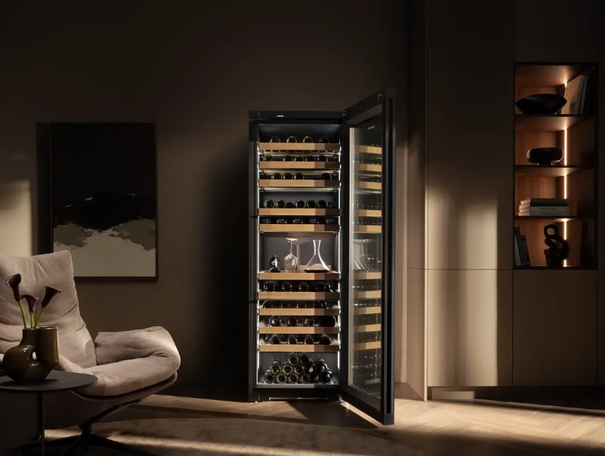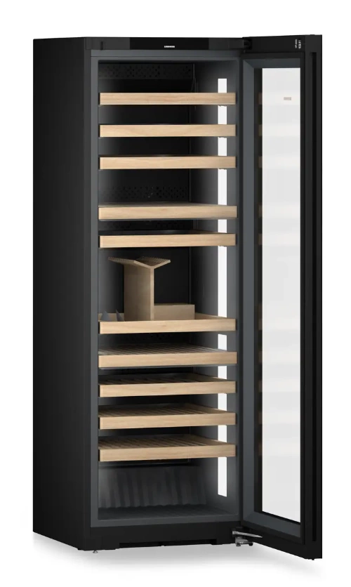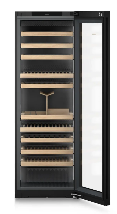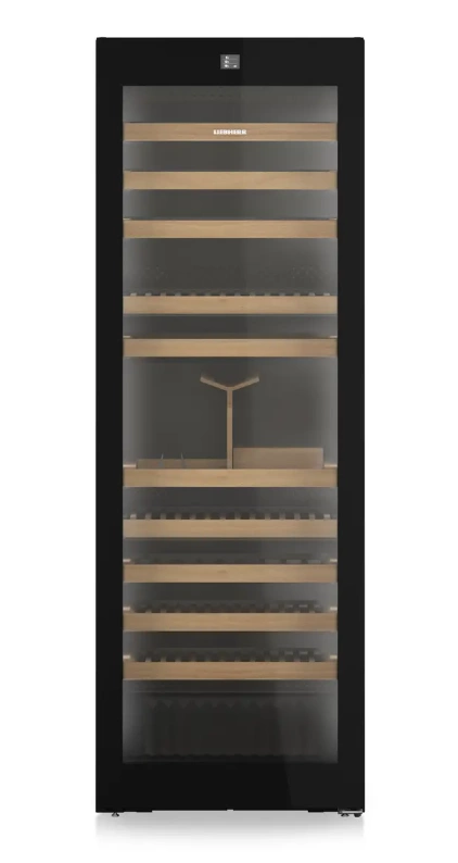 Chłodziarka mieści do 149 butelek Bordeaux (0,75 l) na 11 półkach z drewna bukowego, z czego aż 8 umieszczonych jest na wygodnych szynach teleskopowych. Podwójny panel LED po obu stronach zapewnia równomierne i przyciemniane oświetlenie wnętrza, które efektownie prezentuje kolekcję. Elegancka obudowa BlackSteel doskonale komponuje się z każdym wnętrzem.