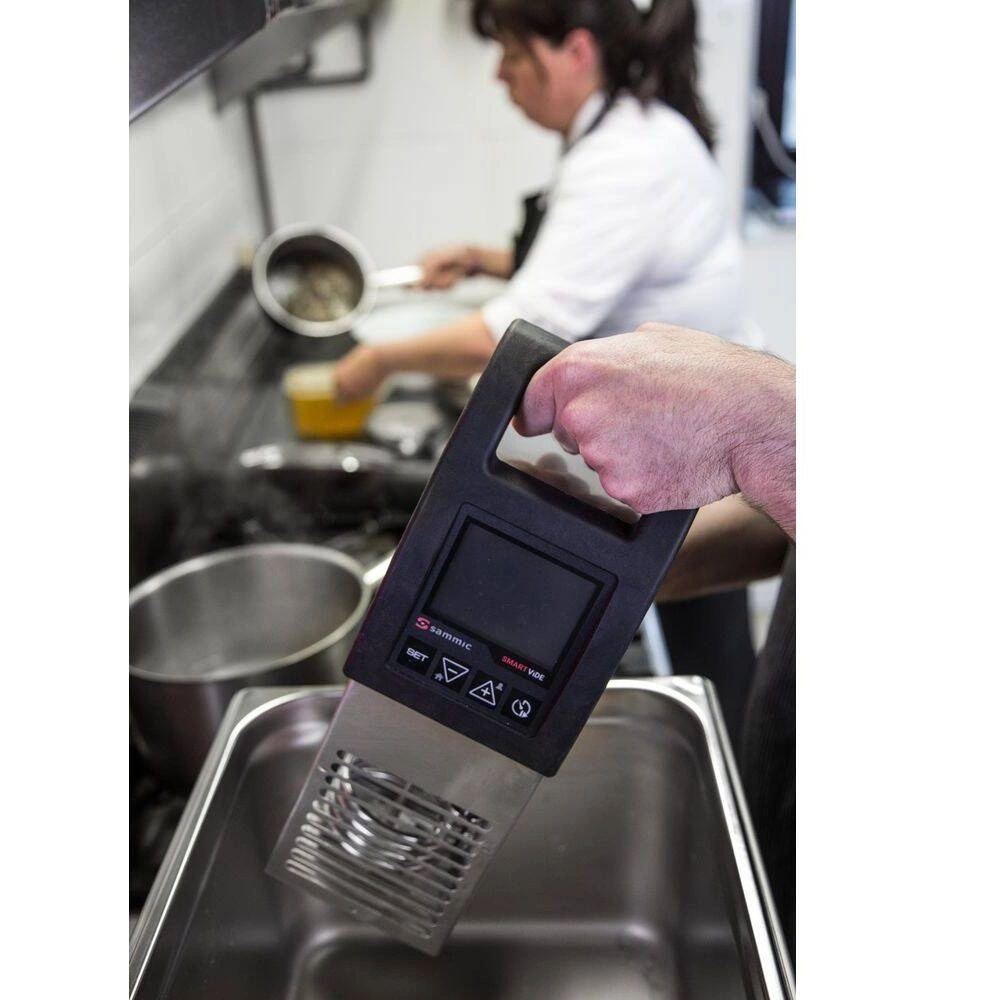 Cyrkulator zanurzeniowy do gotowania SOUS-VIDE "SMARTVIDE 5". Posiada łącze bluetooth co usprawnia proces gotowania oraz umożliwia aktualizację oprogramowania. Po każdym zakończonym cyklu istnieje możliwość wyeksportowania i wydrukowania parametrów obróbki termicznej. Intuicyjne zapisywanie własnych programów gotowania uwzględniając temperaturę oraz czas. Mieszadło z wyposażenia wprowadza wodę w ruch, dzięki czemu temperatura jest na stałym poziomie. Sonda pozwala na kontrolę temperatury wewnątrz produktu. Posiada intuicyjny panel sterowania oraz 3,5" wodoodporny wyświetlacz. Wskaźnik minimalnego poziomu wody zabezpiecza cyrkulator przed uszkodzeniem gdyż nie włączy się gdy nie ma minimalnego wymaganego poziomu wody w pojemniku.