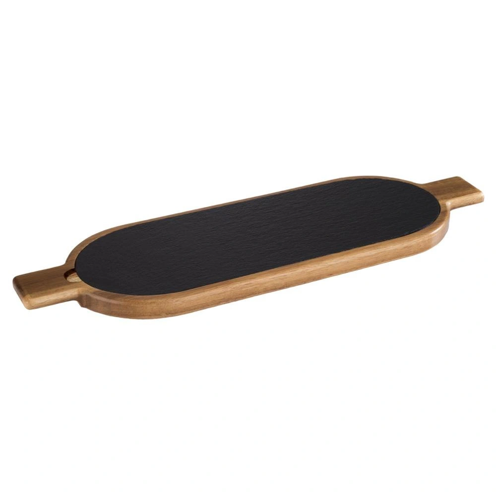 Deska do serwowania FUSIONA została wykonana z dbałością o detale – solidne drewno akacjowe zapewnia stabilność, a blat z naturalnego łupku jest odporny na wilgoć i łatwy w czyszczeniu. Ozdobne uchwyty umożliwiają wygodne przenoszenie deski z kuchni na stół. Produkt doskonale nadaje się do serwowania serów, wędlin, sushi, owoców oraz innych przekąsek, podkreślając walory estetyczne przygotowanych dań.