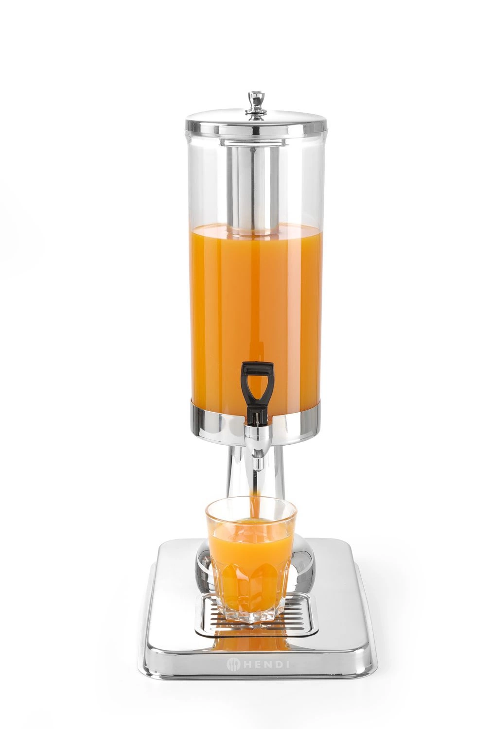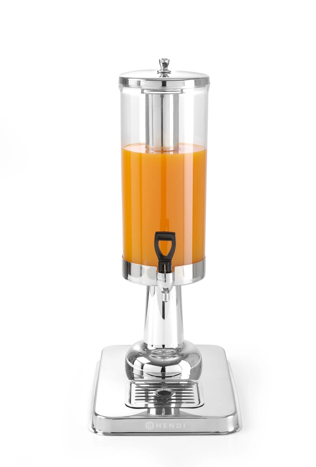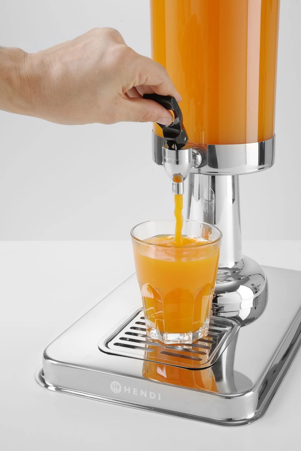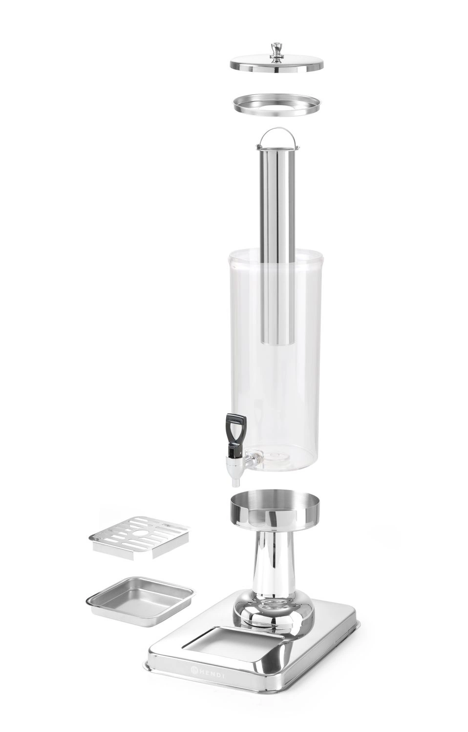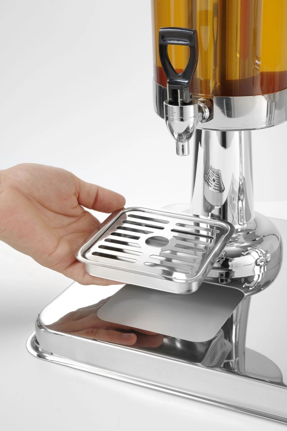 Dyspenser, dozownik do soków o pojemności 3 l. Posiada stalowy wkład na lód schładzający napój. Łatwa do czyszczenia kratka ociekowa. Zbiornik na sok wykonany z poliwęglanu. Niekapiący kranik.