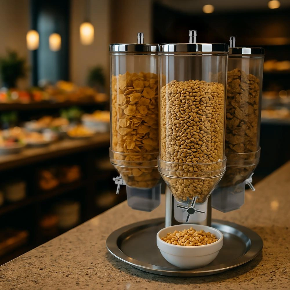 Dozownik ROTATION doskonale sprawdza się w hotelowych salach śniadaniowych, restauracjach, bufetach oraz innych miejscach, gdzie liczy się zarówno wygoda serwowania, jak i estetyka podania. Pozwala na higieniczne i ekonomiczne dozowanie płatków, musli, bakalii czy orzechów. Jego duża pojemność i solidna konstrukcja czynią go idealnym rozwiązaniem dla miejsc o dużym natężeniu ruchu.