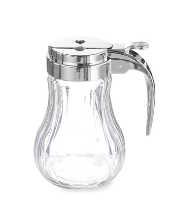 Dyspenser do miodu wykonany ze szkła. Dozownik wykonany z chromowanego tworzywa sztucznego.