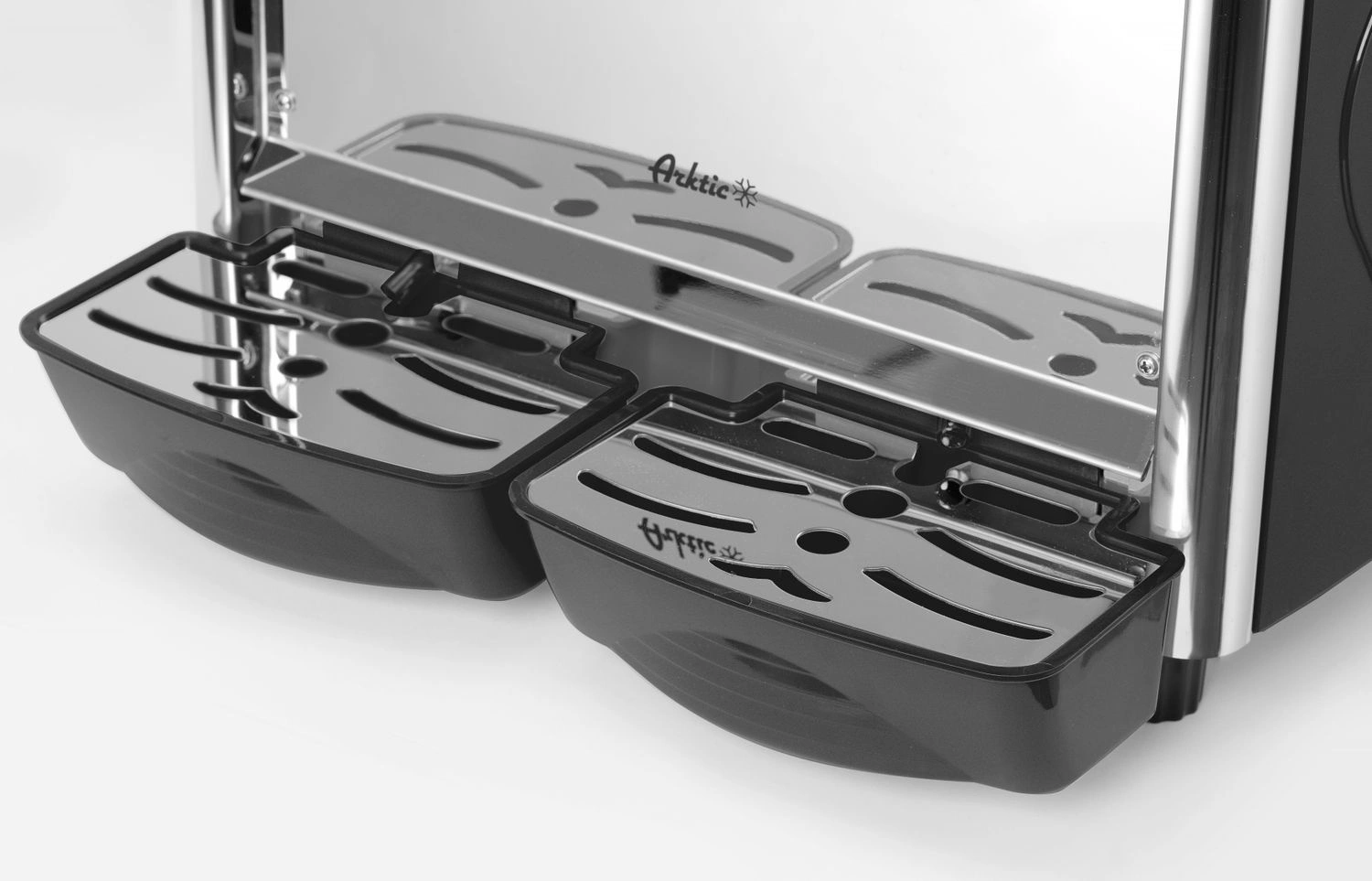 Dyspenser do soków, dystrybutor do zimnych napojów o pojemności 2x12 l. Dwa 12-litrowe zbiorniki z kranem do szybkiego nalewania. Regulacja temperatury od 2°C do 8°C. Prosty demontaż zbiorników ułatwia czyszczenie. Taca ociekowa w zestawie.