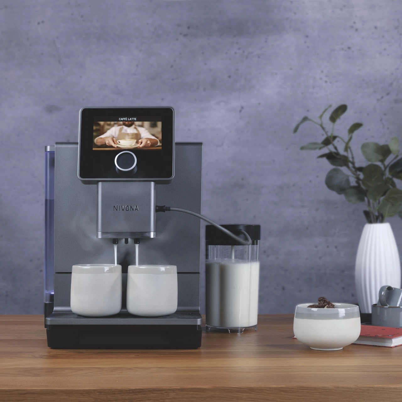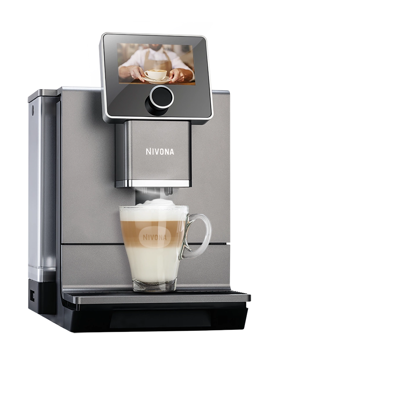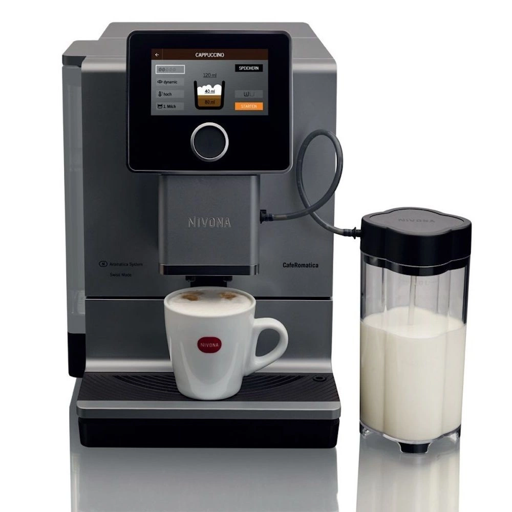 Automatyczny ekspres ciśnieniowy do kawy Cafe Romatica 970 marki NIVONA z elektronicznym sterowaniem. Funkcja "moja kawa" - pozwala na programowanie własnych przepisów na kawę. 9 przepisów fabrycznych. Pojemnik na ziarna o pojemności 270 g. Dodatkowo pojemnik na 1 porcję kawy mielonej. Wyjmowany zbiornik na wodę o pojemności 2,2 litra. Możliwość parzenia dwóch kaw mlecznych jednocześnie.