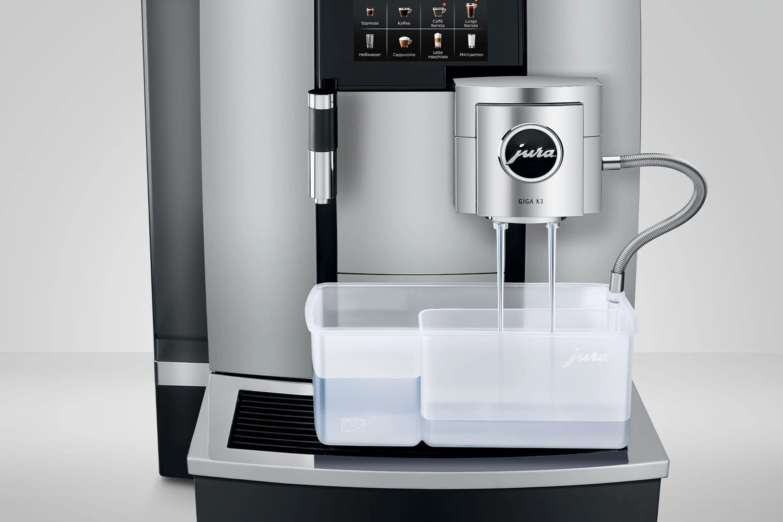 Ekspres GIGA X3 jest kompatybilny z szeroką gamą akcesoriów, takich jak podgrzewacz do filiżanek czy systemy rozliczeniowe, co pozwala na dopasowanie urządzenia do indywidualnych potrzeb firmy lub punktu gastronomicznego. W zestawie znajduje się, wężyk do spieniacza mleka, filtr do wody CLARIS oraz nadajnik Smart Connect, umożliwiający obsługę ekspresu przez aplikację oraz integrację z systemami płatności mobilnych Ekspres wyposażony jest również w funkcje automatycznego czyszczenia i odkamieniania, co znacznie ułatwia utrzymanie higieny. Oryginalne produkty do konserwacji oraz zintegrowane programy płukania i czyszczenia zapewniają bezpieczeństwo użytkowania i certyfikat higieniczny TÜV.
