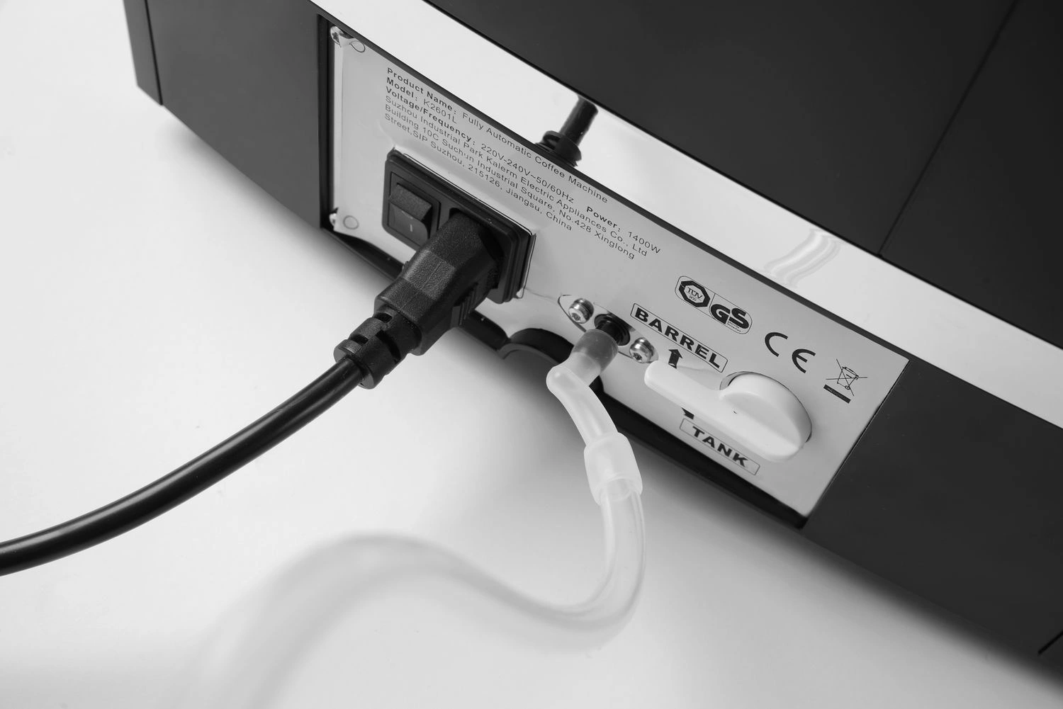 Zintegrowany powiększony zbiornik na wodę i fusy. Dotykowy panel sterowania, cyfrowy wyświetlacz funkcji, komend, błędów. Wbudowany młynek z regulacją stopnia mielenia kawy. Możliwość korzystania z kawy już zmielonej. Pojemnik na świeżą wodę: 6 l. Możliwość podłączenia do zewnętrznego pojemnika o większej pojemności. Automatyczny program myjący.