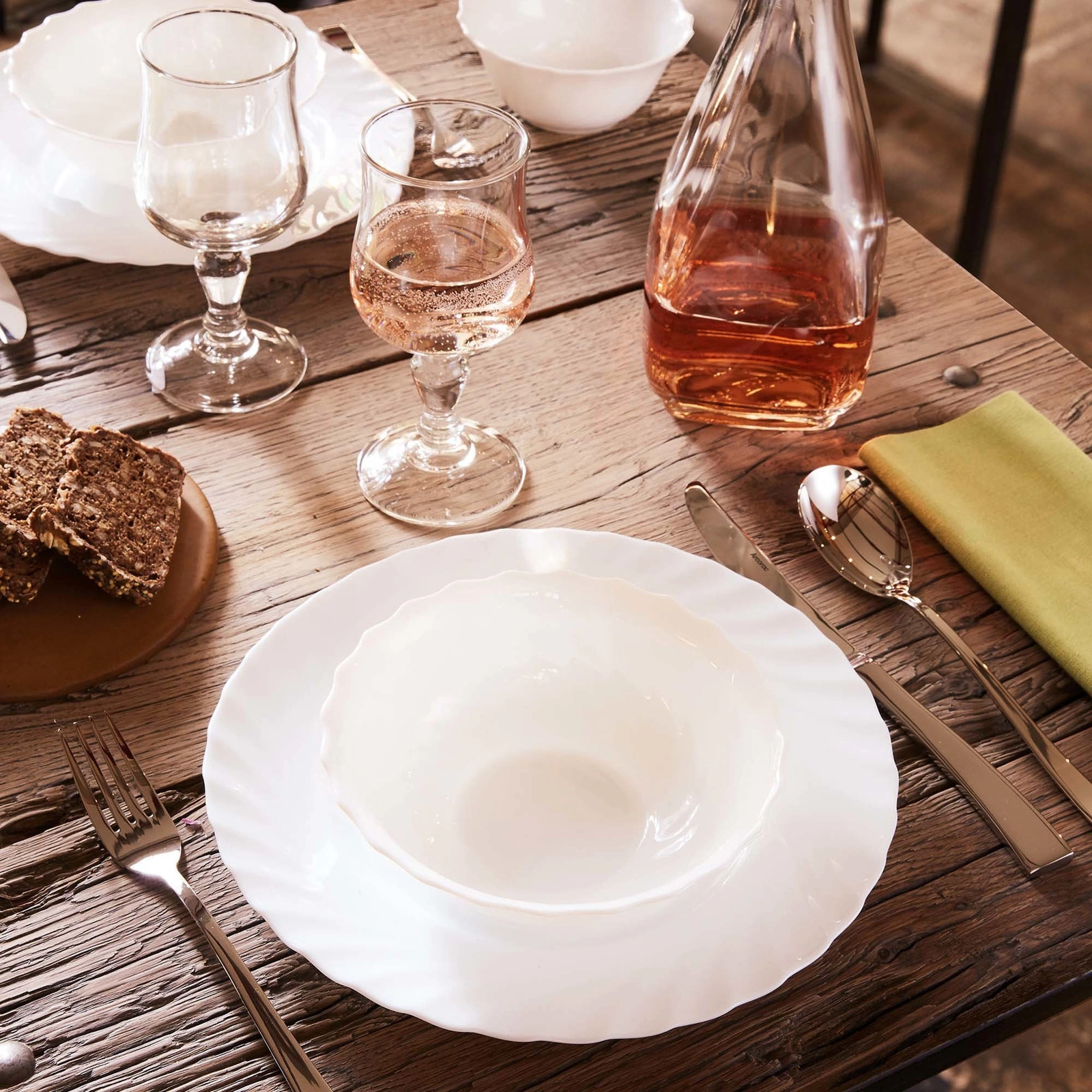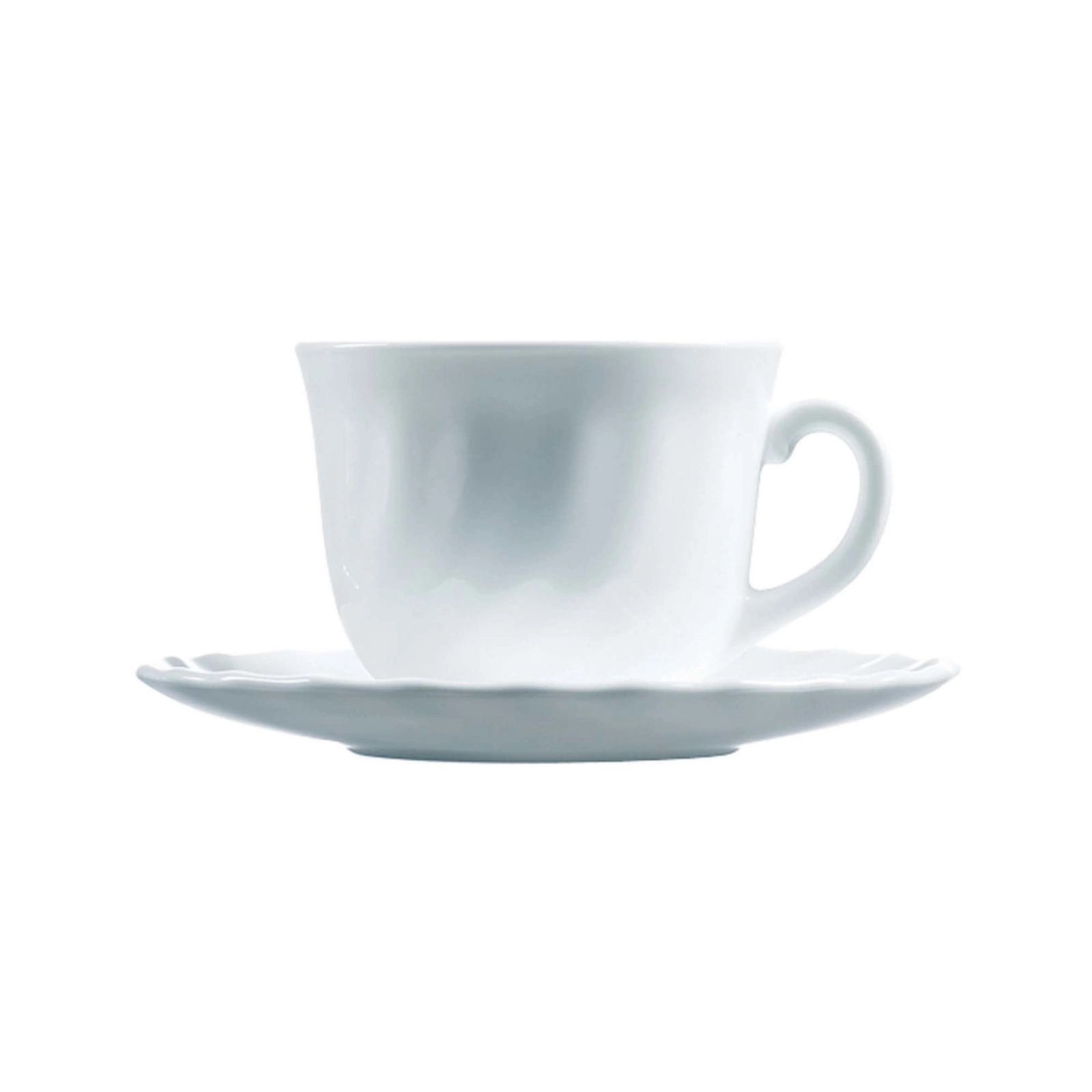 Filiżanka do kawy z linii TRIANON o pojemność 220 ml. Wykonana z białego hartowanego szkła Arcoroc. Ścianki filiżanki zdobi delikatna fala, która nadaje im lekkości i elegancji. Filiżanki można myć w zmywarce i stosować w kuchenkach mikrofalowych.