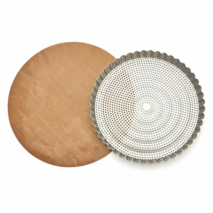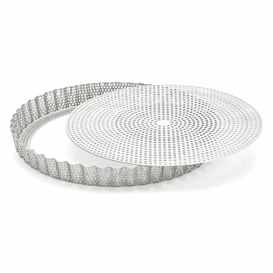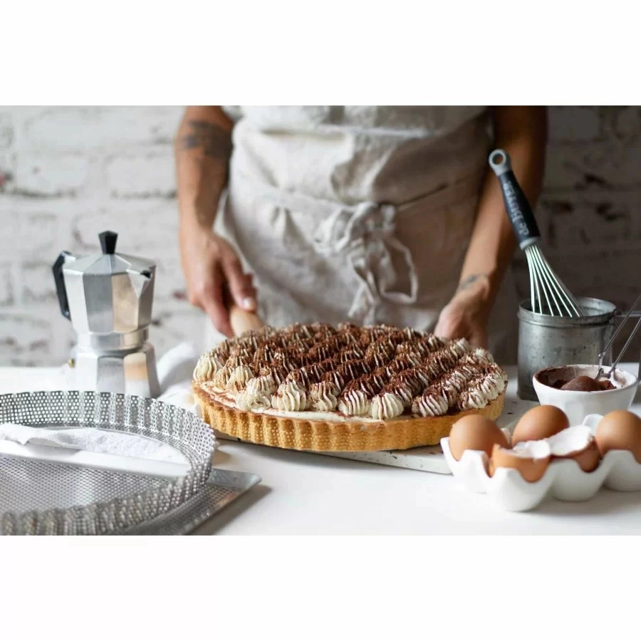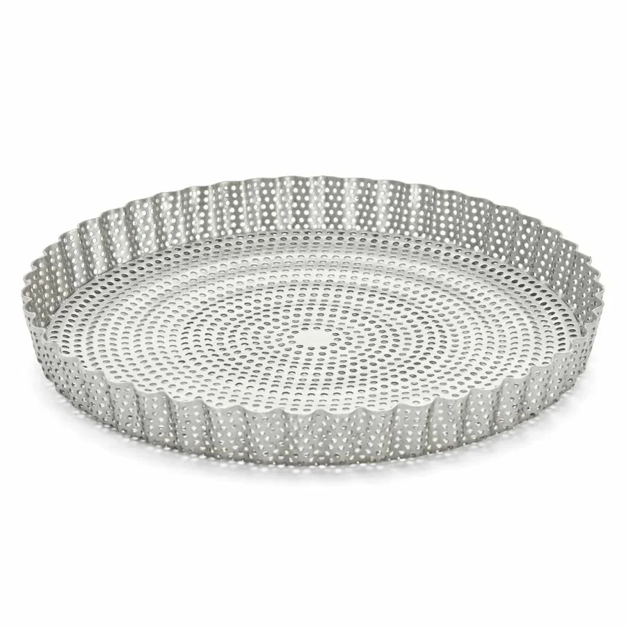 Forma do tarty marki DE BUYER to profesjonalne narzędzie, które zostało zaprojektowane z myślą o intensywnym użytkowaniu w profesjonalnej gastronomii. Wykonana z perforowanej stali nierdzewnej, jest idealna zarówno do słodkich, jak i wytrawnych tart. Dzięki technologii AIR SYSTEM®, forma zapewnia równomierne pieczenie i perfekcyjne odprowadzanie pary, co skraca czas pieczenia o 15-25% i pozwala na uzyskanie chrupiącego wierzchu oraz idealnie wykończonych krawędzi ciasta. Formy można używać samodzielnie lub z wkładem - papierem do pieczenia, który jest dołączony do zestawu. Wkład wykonany z włókna szklanego pokrytego teflonem (PTFE) można stosować wielokrotnie (ponad 200 razy), a jego zakres temperatur to od -170°C do 260°C.