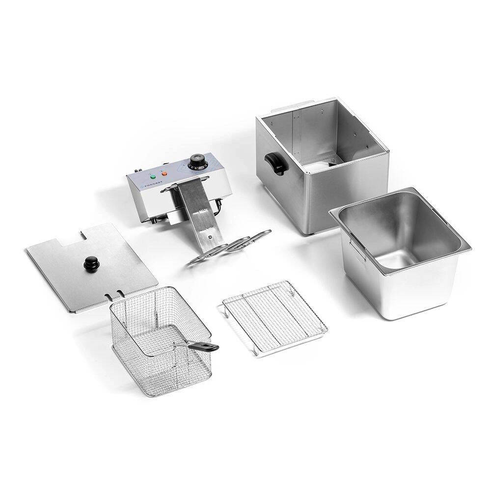 Elektryczna frytownica FORGAST FG09008 to sprzęt, który łączy wysoką wydajność z bezpieczeństwem i łatwością utrzymania czystości. Dzięki precyzyjnej regulacji temperatury oraz zimnej strefie umożliwia osiągnięcie doskonałych rezultatów smażenia przy jednoczesnym ograniczeniu zużycia oleju. Solidna konstrukcja i przemyślane rozwiązania techniczne sprawiają, że jest to urządzenie niezawodne i wygodne w codziennym użytkowaniu. To idealny wybór dla każdego profesjonalisty oczekującego niezawodności, efektywności oraz łatwości obsługi i czyszczenia.
