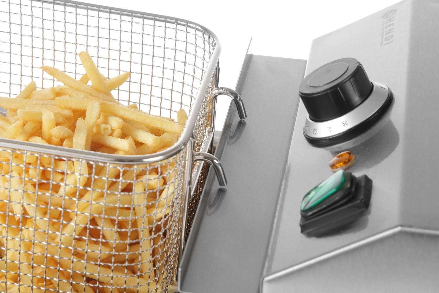 Frytownica elektryczna Master Cook o pojemności 8 l. Wykonanie -  stal chromowa. Frytkownica przeznaczona do profesjonalnej gastronomii. Świetnie nadaje się nie tylko do smażenia frytek, ale także do smażenia w głębokim tłuszczu kiełbasek, ryb, krokietów, mięsa itp. Konstrukcja komory zapewnia utrzymanie tzw. zimnej strefy, która zabezpiecza przed spalaniem drobnych resztek produktów. Termostat z lampką kontrolną chroni frytownicę przed przegrzaniem. Przy czym termostat można ponownie uruchomić przy pomocy przycisku restartującego znajdującego się na dole frytownicy.  Uchwyt do zawieszenia koszyka umożliwia odsączanie przygotowanych produktów. Regulacja temperatury w zakresie do 195ºC przy pomocy pokrętła.
