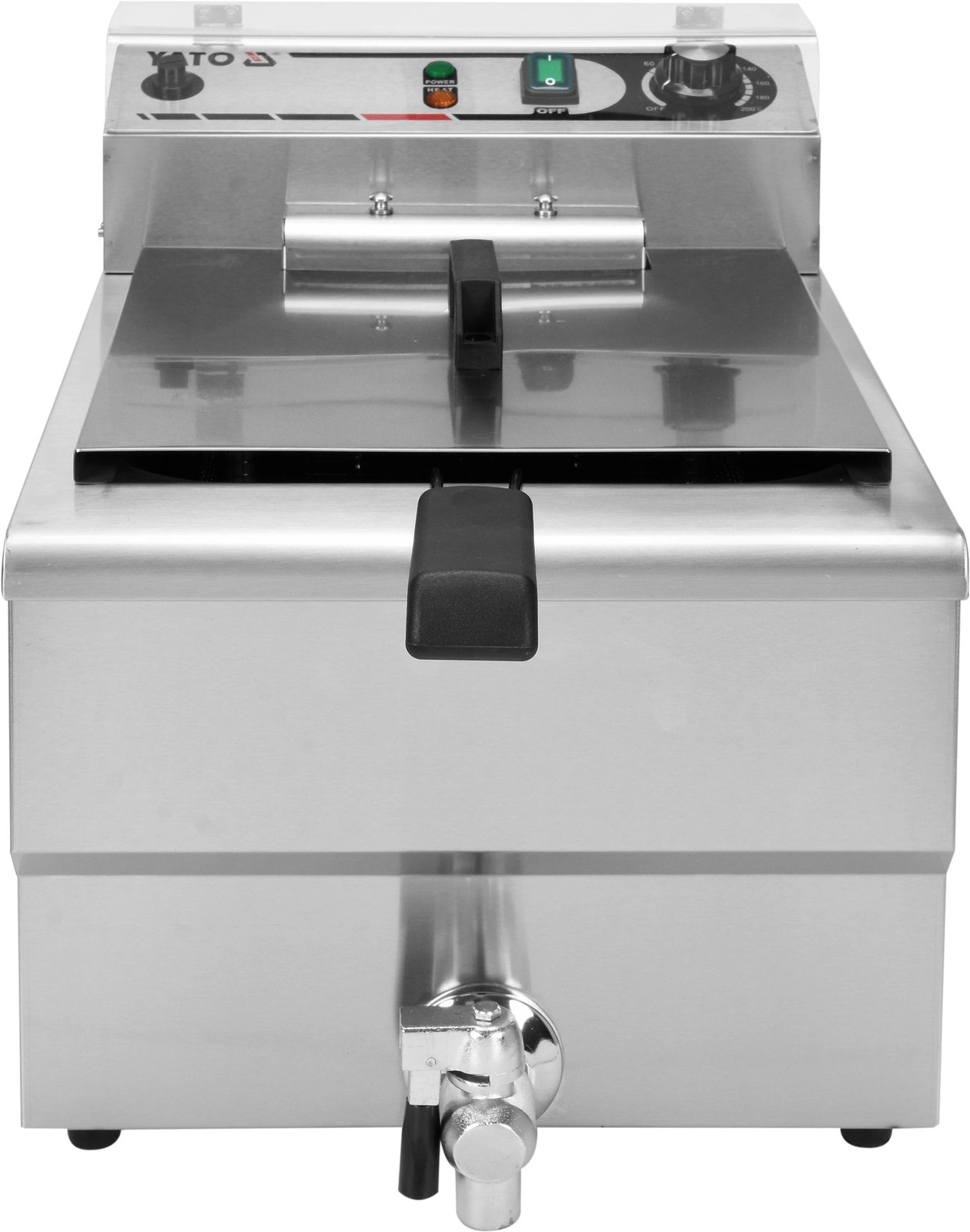 Frytownica 1-komorowa z kranem spustowym o pojemności 12L marki YATO. Przeznaczona jest do smażenia w głębokim tłuszczu: frytek, mięsa, ryb, krokietów, warzyw. Zbiornik frytownicy ma całkowitą pojemność wlewczą 16L. Natomiast minimalny poziom oleju wynosi 9L, a maksymalny 12L.