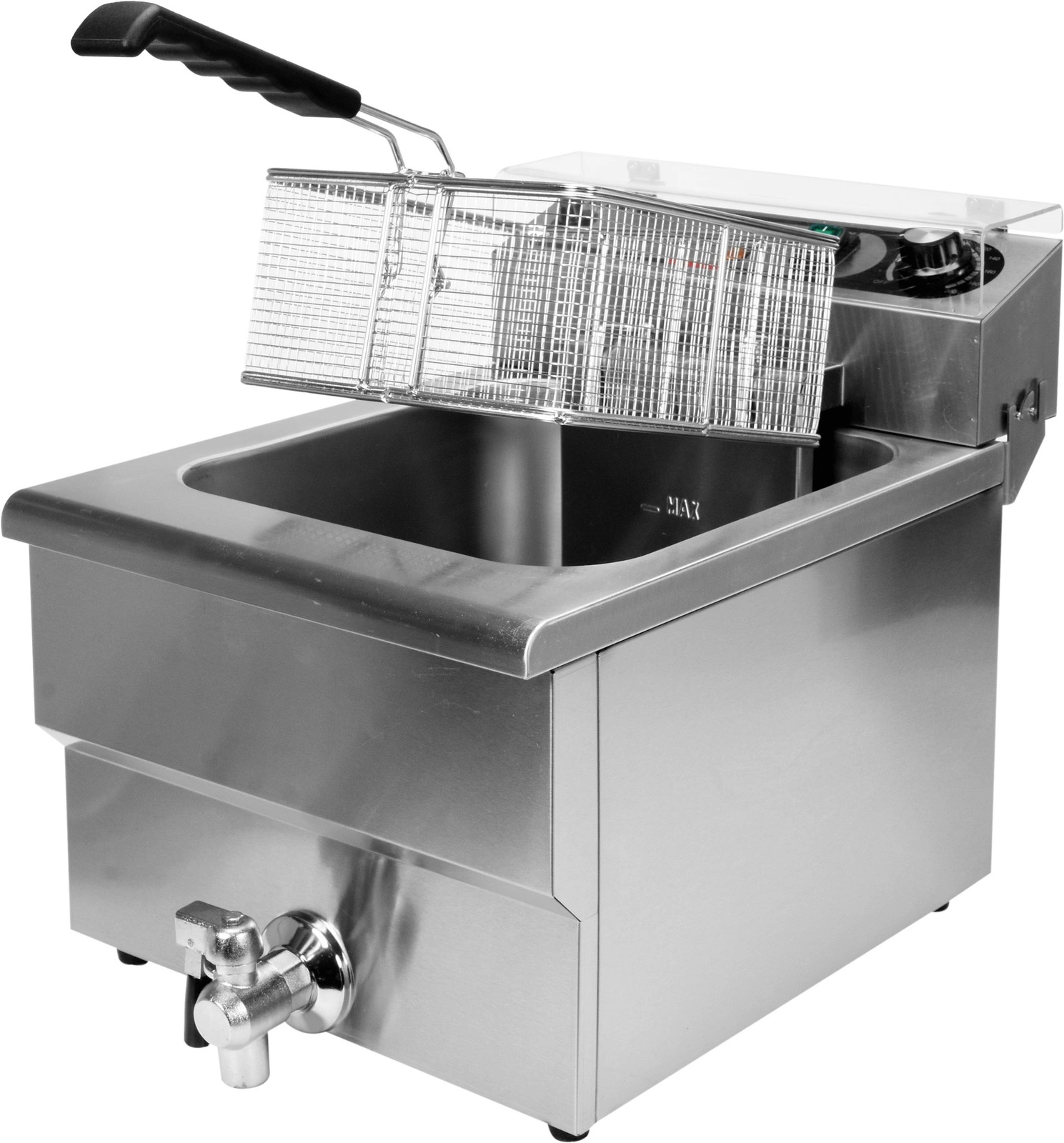 Grzałka o mocy 5 kW sterowana jest za pomocą potencjometru umieszczonego na panelu sterującym. Możliwe jest ustawienie temperatury pracy w zakresie 60~200℃. Zainstalowany bryzgoszczelny wyłącznik pozwala na wyłączenie urządzenia, bez konieczności odłączania kabla zasilającego z sieci. Dodatkowo panel sterujący posiada osłonę zabezpieczającą wykonaną z bardzo wytrzymałego poliwęglanu, która chroni panel przed zachlapaniem olejem podczas smażenia. Dzięki temu utrzymanie frytownicy w czystości jest znacznie ułatwione. Wyjmowana grzałka ma możliwość powieszenia jej na specjalnym uchwycie w pozycji, w której ściekający olej trafia z powrotem do zbiornika. Frytownica posiada dodatkowe zabezpieczenie, które automatycznie wyłącza grzałkę w momencie wyciągnięcia jej ze zbiornika. Dodatkowe zabezpieczenie chroni ją przed przegrzaniem, przy temperaturze powyżej 260℃.