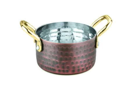 Przedstawiamy elegancki garnek w efektownym kolorze antycznej miedzi z młotkowaną fakturą. To niewielkie naczynie o pojemności 350 ml doskonale sprawdzi się zarówno do serwowania, jak i przygotowywania niewielkich porcji potraw. Idealny do profesjonalnych kuchni, restauracji, a także do domowego serwowania sosów, zup czy deserów.