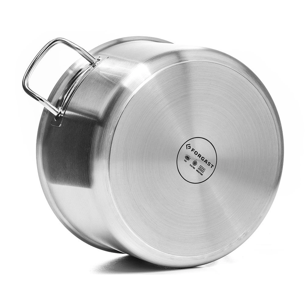 Garnek FORGAST FG02540 posiada ścianki o grubości 1 mm, co zapewnia odpowiednią wytrzymałość oraz szybkie osiąganie temperatury roboczej. Wielowarstwowe dno typu sandwich (stal nierdzewna-aluminium-stal nierdzewna) o grubości 5 mm sprawia, że ciepło jest równomiernie rozprowadzane po całej powierzchni dna, zapobiegając przypalaniu potraw. Dzięki temu garnek doskonale sprawdzi się zarówno w kuchniach restauracyjnych, jak i podczas cateringu czy przygotowywania dań na dużych imprezach. Masywne, nitowane uchwyty zapewniają bezpieczeństwo i komfort użytkowania nawet przy pełnym obciążeniu naczynia.