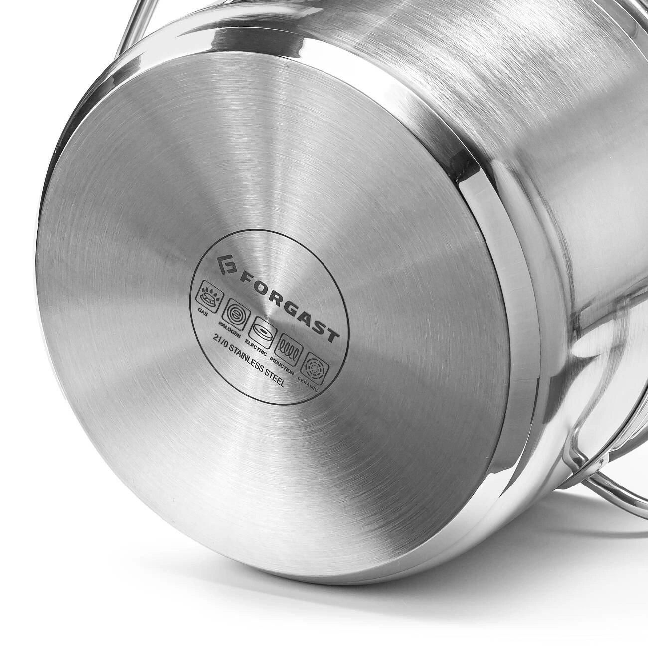 Solidna konstrukcja garnka FORGAST FG02832 oparta jest na grubych ściankach ze stali nierdzewnej o grubości 0,7 mm oraz dnie kapsułowym, które doskonale magazynuje i rozprowadza ciepło. Dzięki temu rozwiązaniu potrawy gotują się równomiernie, a ryzyko przypalenia jest znacznie mniejsze. Garnek świetnie sprawdza się w profesjonalnych kuchniach – można w nim przygotować zarówno klasyczne zupy, jak i dania wymagające długiego duszenia. Pokrywka o grubości 0,8 mm skutecznie zatrzymuje parę, co wpływa na smak i aromat potraw.