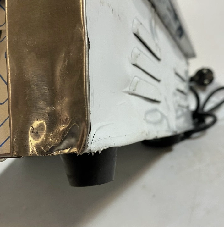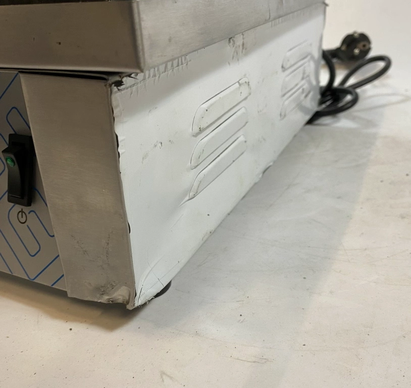 Urządzenie pochodzi z ekspozycji- posiada na obudowie niewielkie rysy. Narożniki w rynience posiadają widoczne spawy oraz przerwy- po 1 stronie widoczne zagięcie pod obudową pod płytą grzewczą na rodu od dołu oraz od spodu- urządzenie stoi równo.