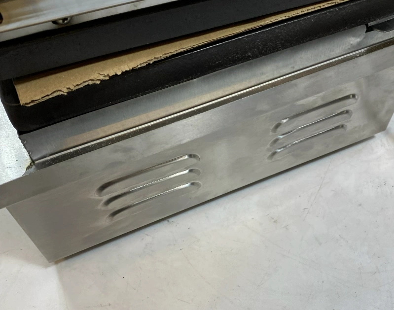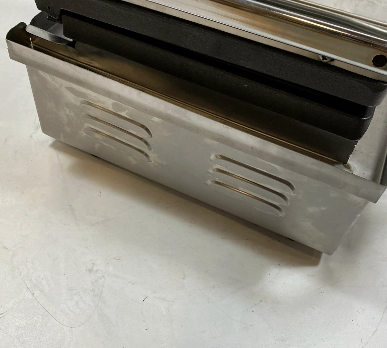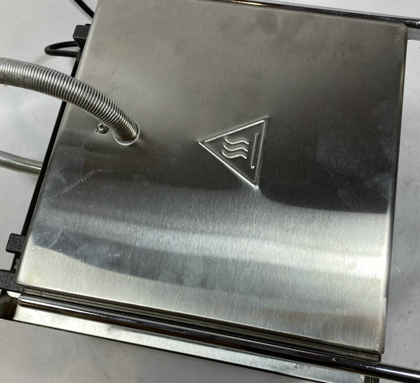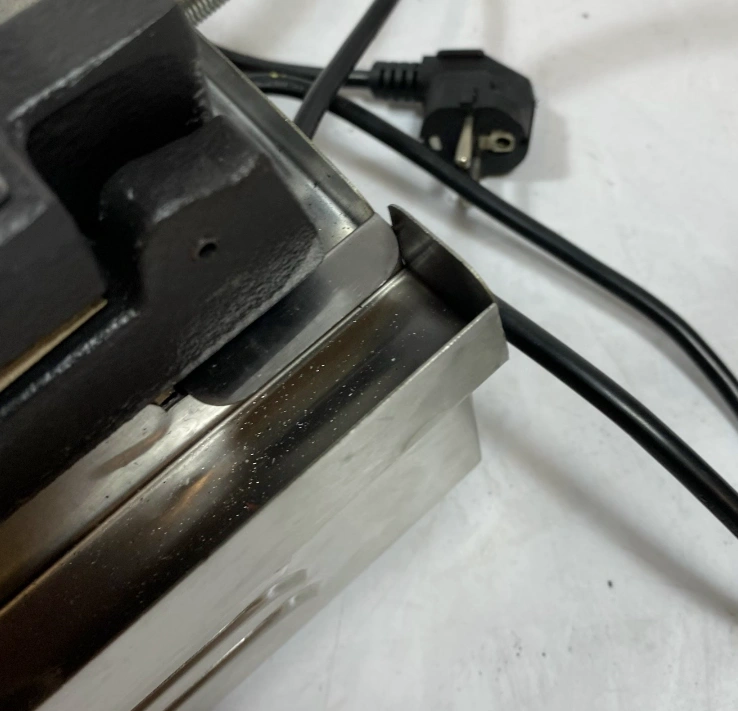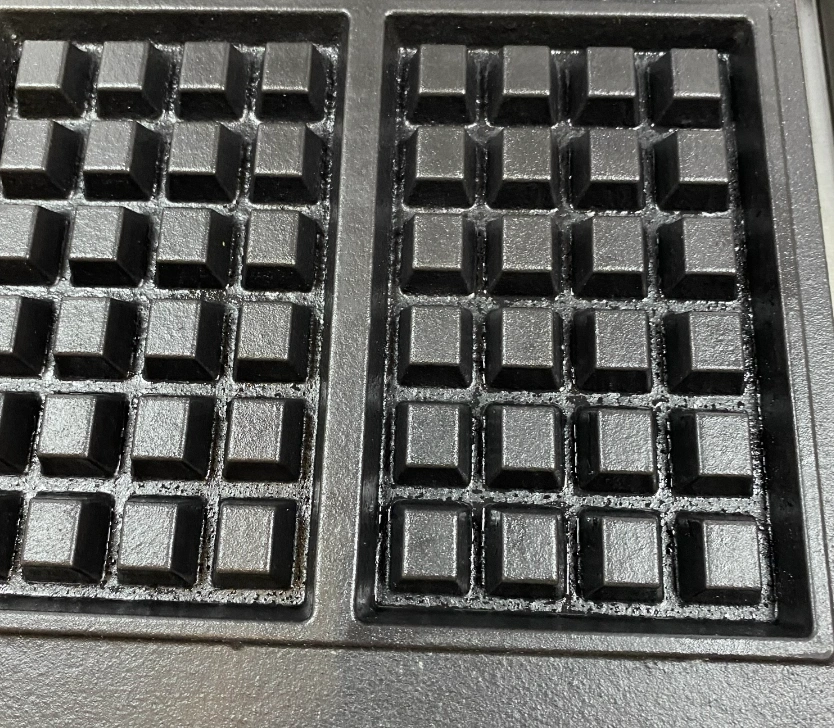 - Wyprofilowana rynienka na resztki ciasta – praktyczne rozwiązanie, które ułatwia utrzymanie czystości wokół płyty grzewczej, minimalizując ilość odpadów i skracając czas potrzebny na sprzątanie po zakończonej pracy.