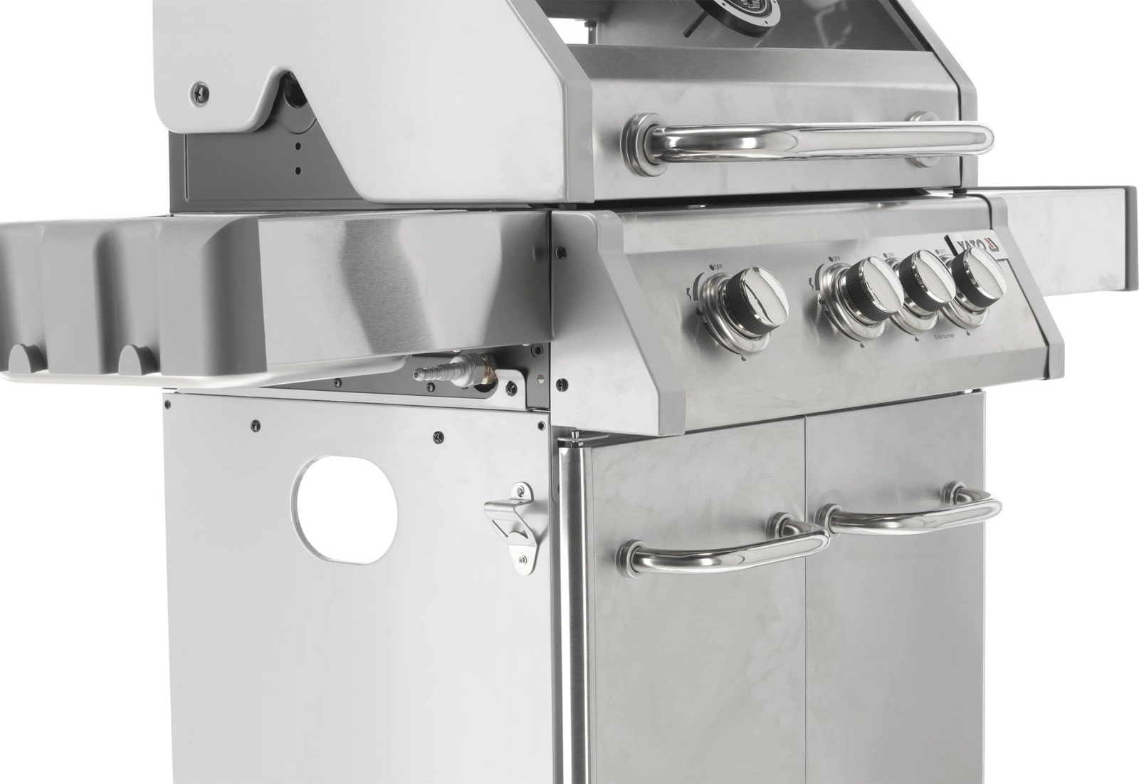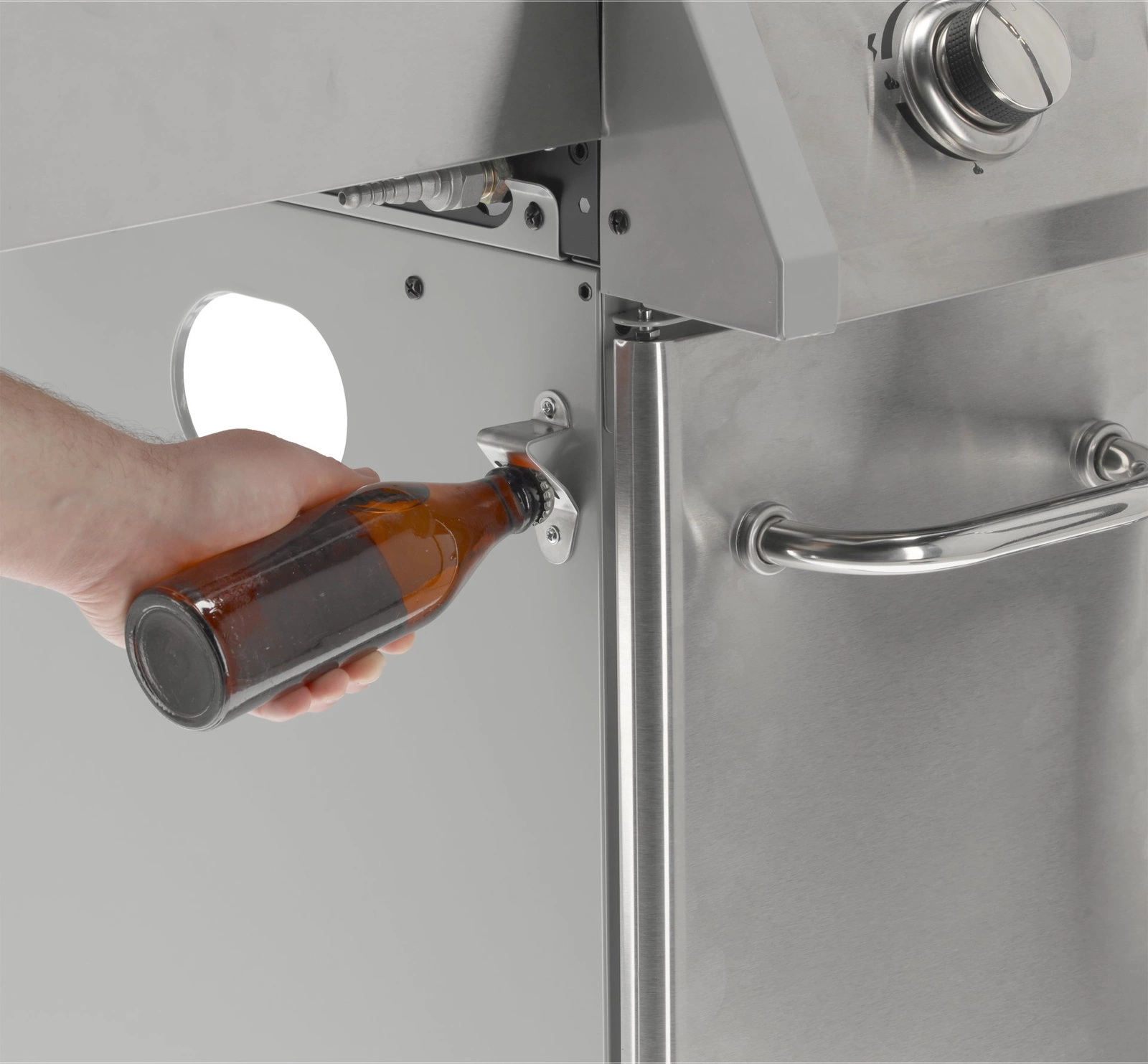 Zestaw 3+1 obejmuje 3 palniki główne ze stali nierdzewnej o mocy 3 kW każdy oraz 1 palnik boczny o mocy 2,2 kW, umożliwiający gotowanie i podgrzewanie potraw w garnku lub na patelni. Łączna moc wynosi 11,2 kW, przy średnim spalaniu gazu 814 g/h. Średnica dyszy 3x0.8 + 1x0.66 mm. Praktyczność grillowania podkreślają półki boczne, pojemna szafka, osłona palnika (aromatyzer), stalowa misa odporna na wysoką temperaturę oraz obrotowe 4 kółka z hamulcem ułatwiające transport. Dodatkowe udogodnienia to 6 wieszaków na półkach bocznych, 4 pokręteł z niebieskim światłem LED informujących o włączonych palnikach, otwieracz do butelek z boku grilla oraz możliwość wysunięcia płyty ściekowej i umycia jej poza grillem.