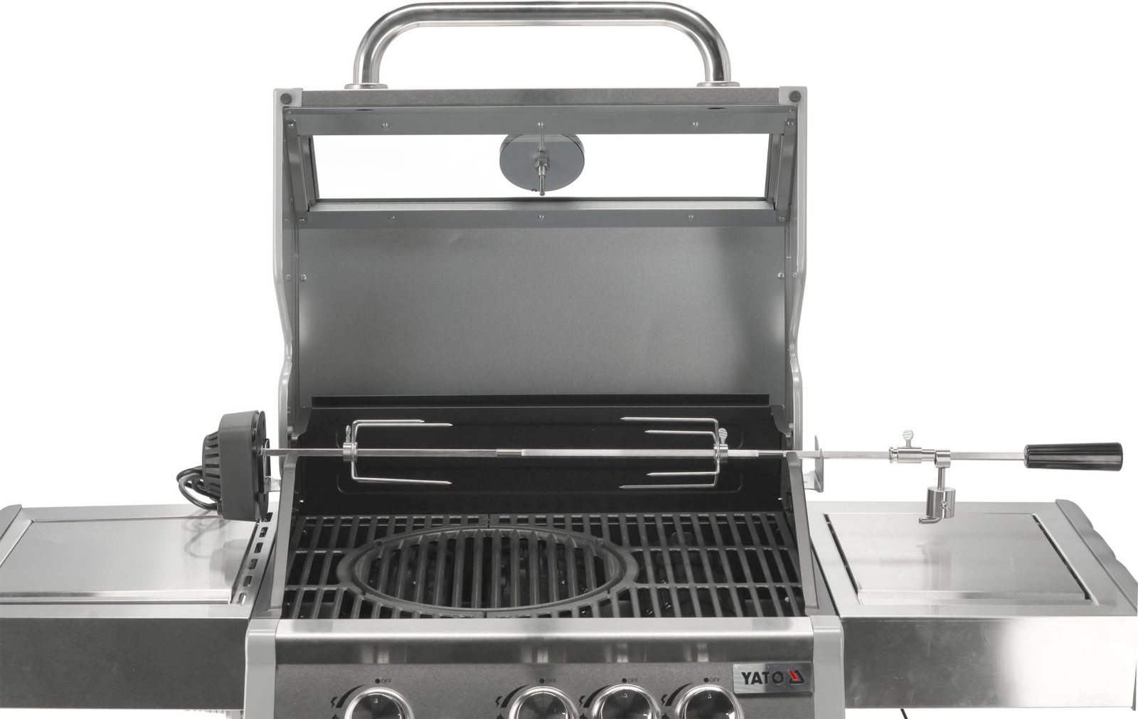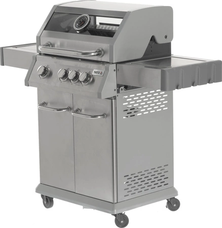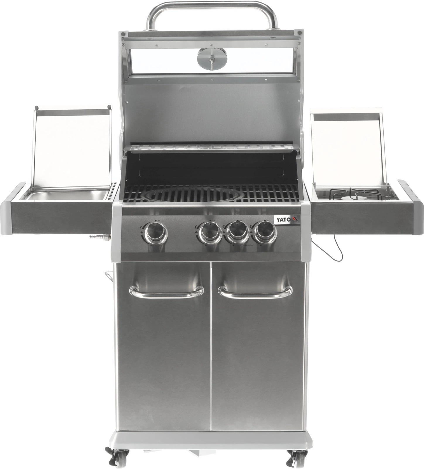 Grill Gazowy 3+1 marki YATO o wymiarach 122x57x114 cm wykonany z wysokiej jakości stali nierdzewnej 403. Centralnym elementem grilla jest szybko nagrzewalny żebrowy ruszt żeliwny o wymiarach 60x41,5 cm, który długo utrzymuje ciepło. Dodatkowo, grill posiada wyjmowany okrągły ruszt o średnicy 30 cm, wbudowany w główny ruszt. Ten element można z łatwością zastąpić kamieniem do pizzy (brak w zestawie), co pozwala na rozszerzenie możliwości grilla. Wygoda użytkowania to także zasługa półek bocznych oraz pojemnej, zamykanej szafki, które ułatwiają przechowywanie niezbędnych akcesoriów, przypraw i innego wyposażenia. Wymiar półki bocznej: 34,5x42,5cm. Dodatkowy palnik boczny o mocy 2,2 kW otwiera nowe możliwości, umożliwiając gotowanie i podgrzewanie potraw w garnku lub na patelni. Atutem jest miejsce na polską butlę gazową 11l, pojemnik ze stali nierdzewnej umieszczony w jednej z półek bocznych oraz wbudowany otwieracz do butelek.