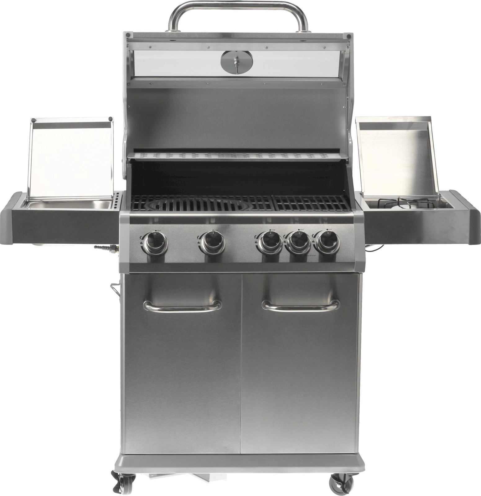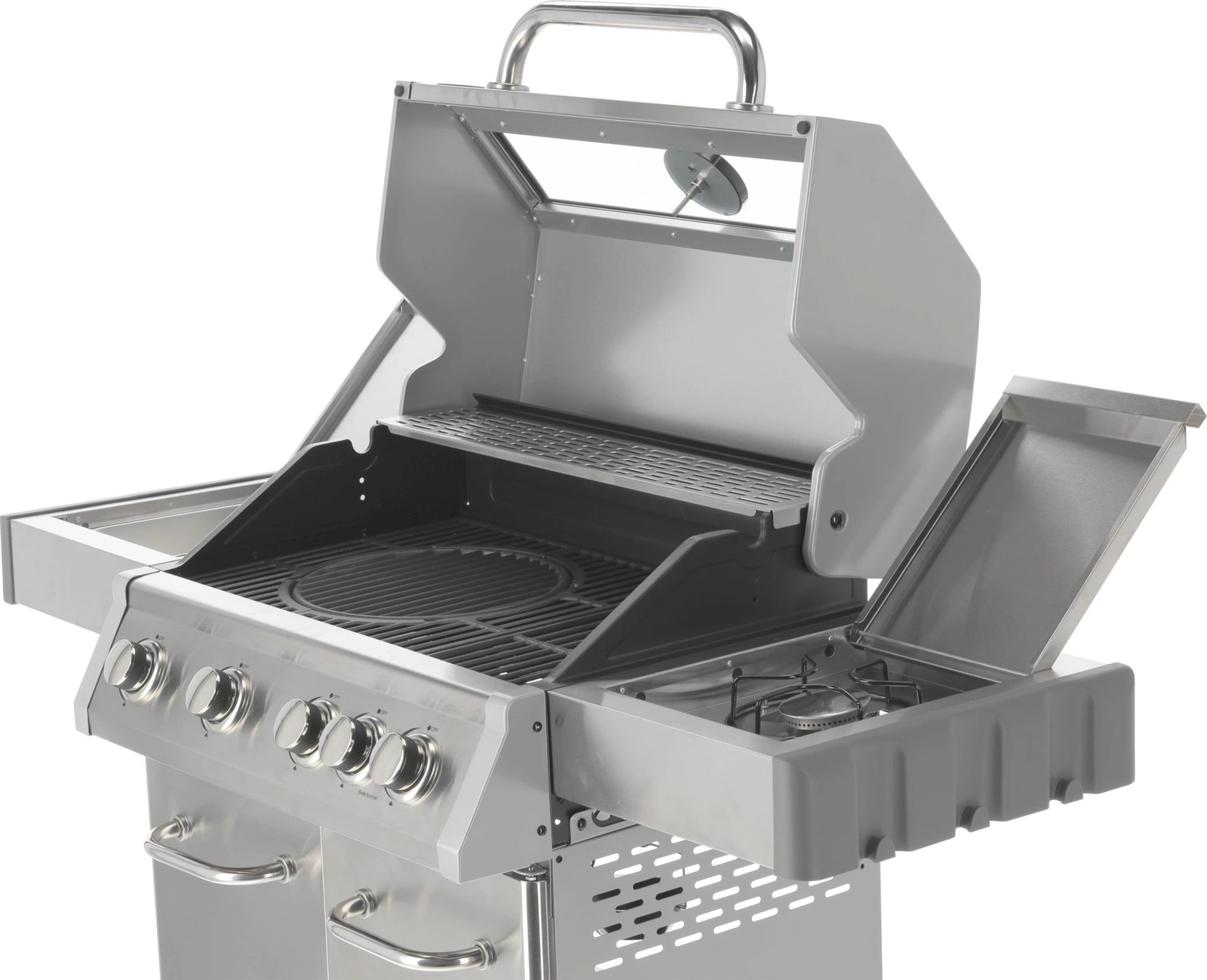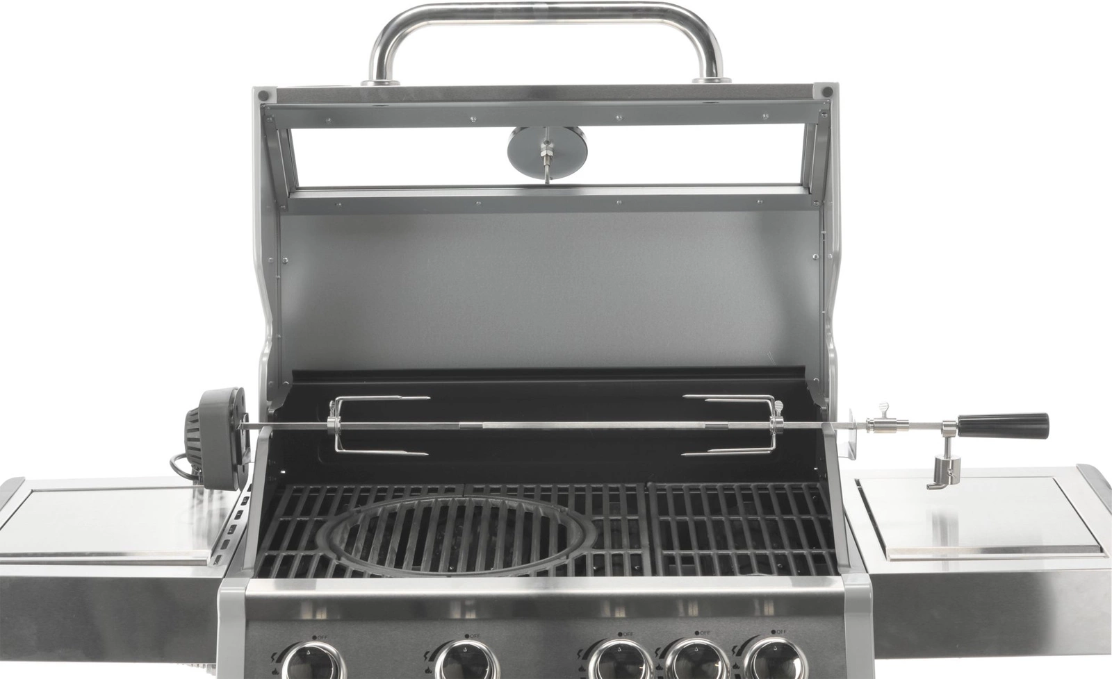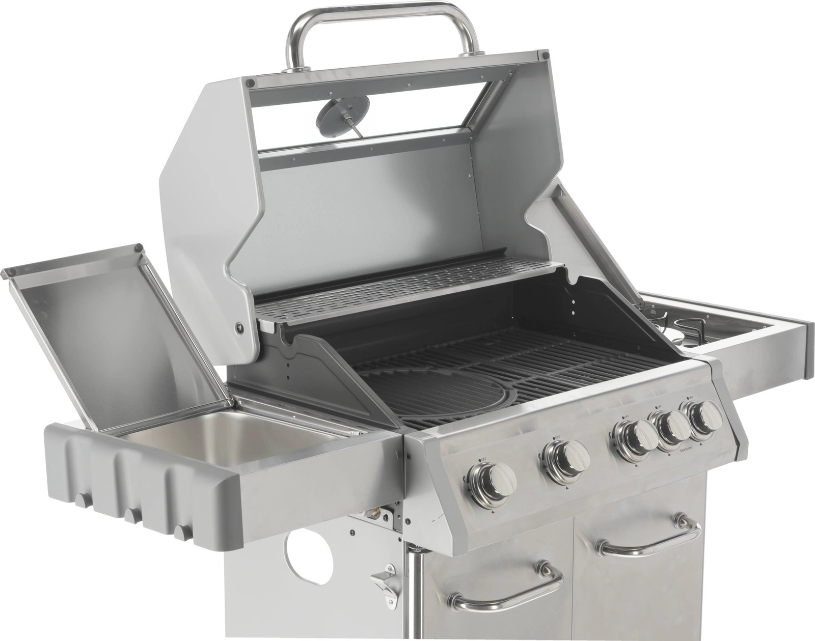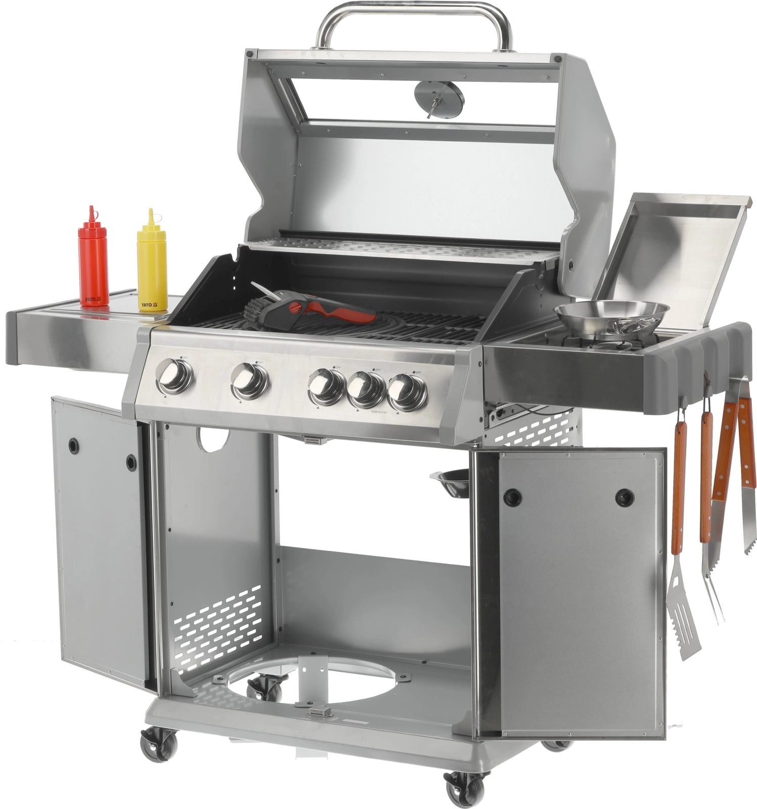 Zestaw 4+1 obejmuje 4 palniki główne ze stali nierdzewnej o mocy 3 kW każdy oraz 1 palnik boczny o mocy 2,2 kW, umożliwiający gotowanie i podgrzewanie potraw w garnku lub na patelni. Łączna moc wynosi 14,2 kW, przy średnim spalaniu gazu 1032 g/h. Średnica dyszy 4x0.8 + 1x0.7 mm. Praktyczność grillowania podkreślają półki boczne, pojemna szafka, osłona palnika (aromatyzer), stalowa misa odporna na wysoką temperaturę oraz obrotowe kółka z hamulcem ułatwiające transport. Dodatkowe udogodnienia to 6 wieszaków na półkach bocznych, 5 pokręteł z niebieskim światłem LED informujących o włączonych palnikach, otwieracz do butelek z boku grilla oraz możliwość wysunięcia płyty ściekowej i umycia jej poza grillem.