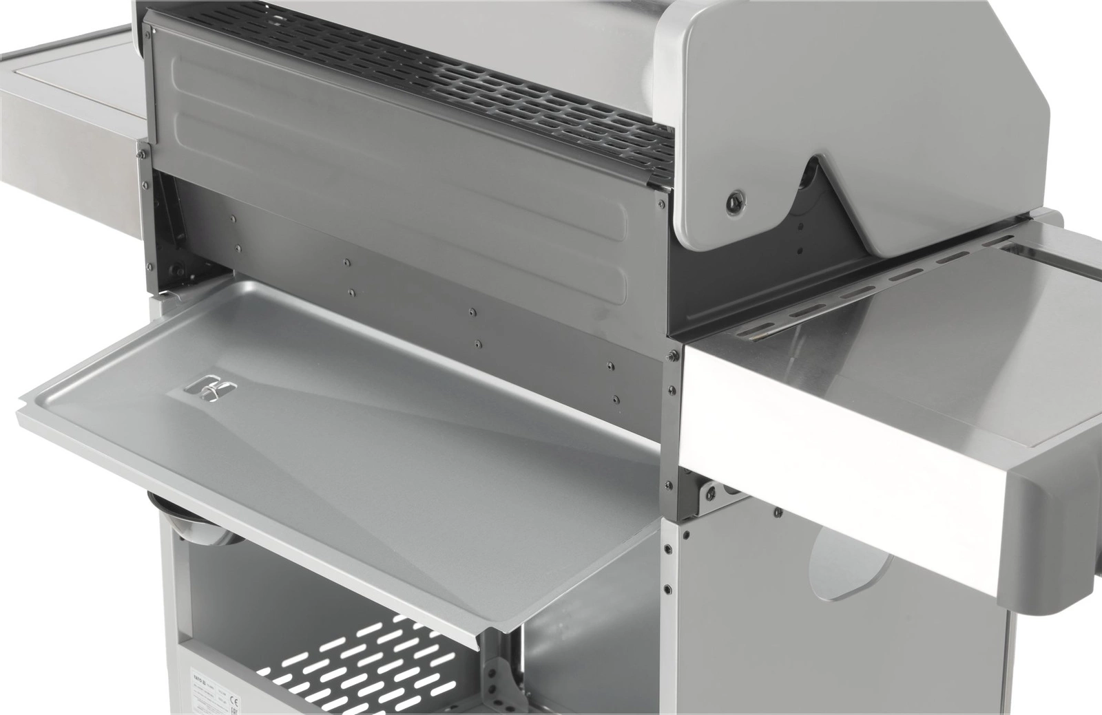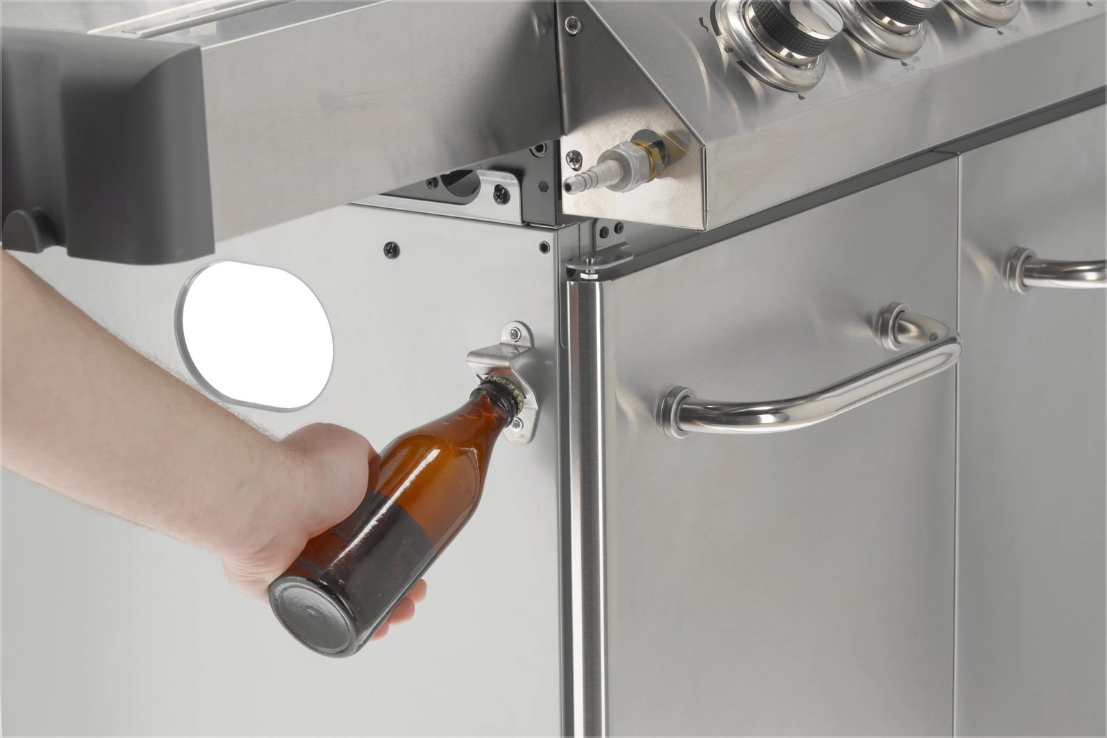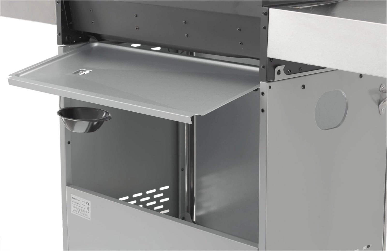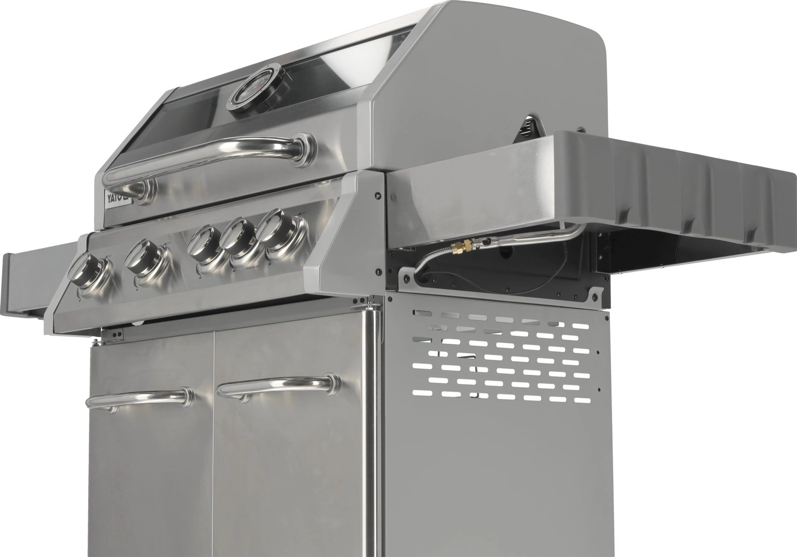 Zestaw 4+1 obejmuje 4 palniki główne ze stali nierdzewnej o mocy 3 kW każdy oraz 1 palnik boczny o mocy 2,2 kW, umożliwiający gotowanie i podgrzewanie potraw w garnku lub na patelni. Łączna moc wynosi 14,2 kW, przy średnim spalaniu gazu 1032 g/h. Średnica dyszy 4x0.8 + 1x0.7 mm. Praktyczność grillowania podkreślają półki boczne, pojemna szafka, osłona palnika (aromatyzer), stalowa misa odporna na wysoką temperaturę oraz obrotowe kółka z hamulcem ułatwiające transport. Dodatkowe udogodnienia to 6 wieszaków na półkach bocznych, 5 pokręteł z niebieskim światłem LED informujących o włączonych palnikach, otwieracz do butelek z boku grilla oraz możliwość wysunięcia płyty ściekowej i umycia jej poza grillem.