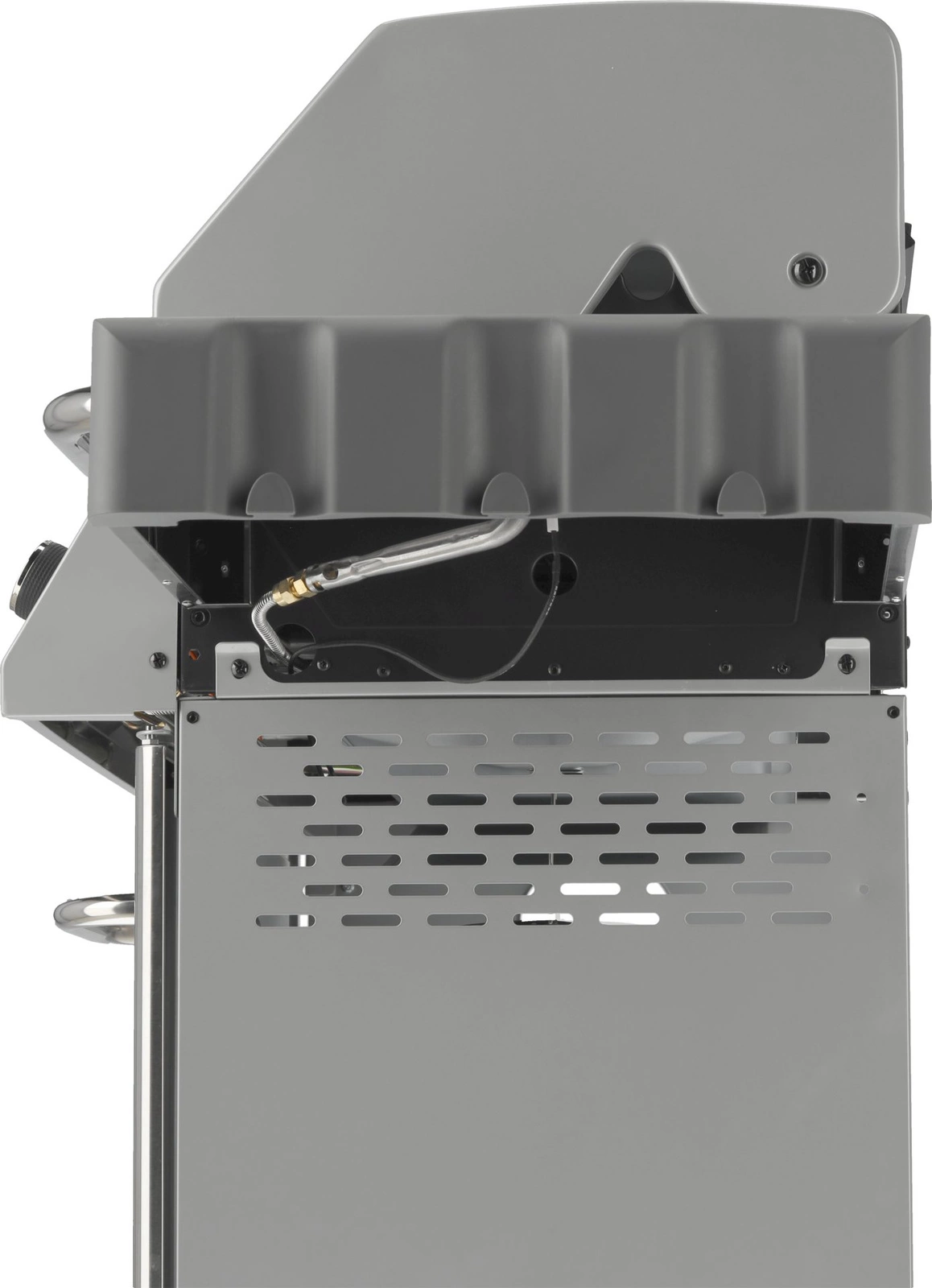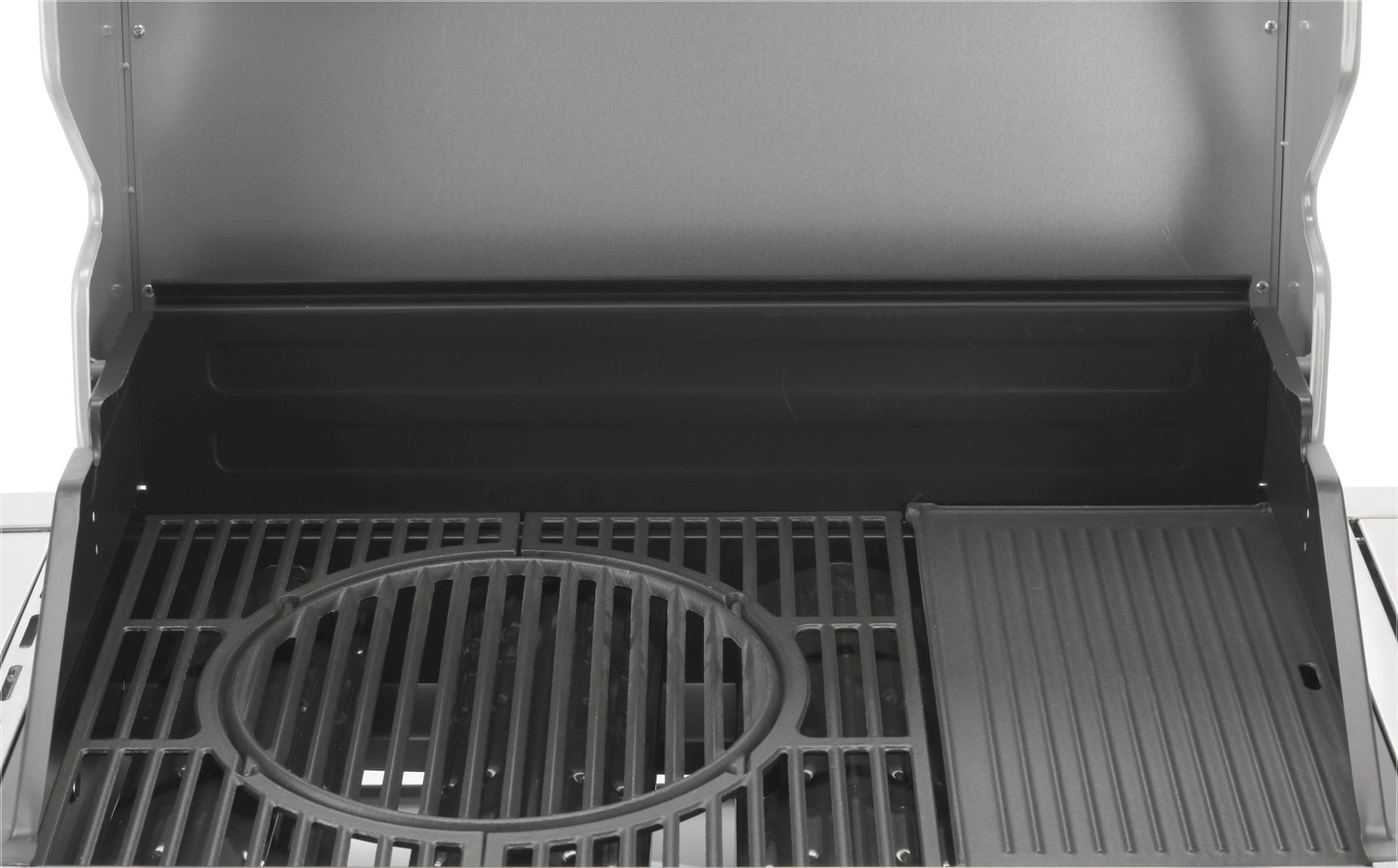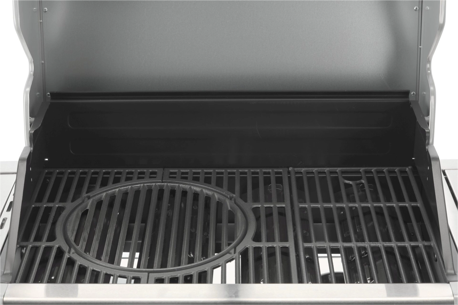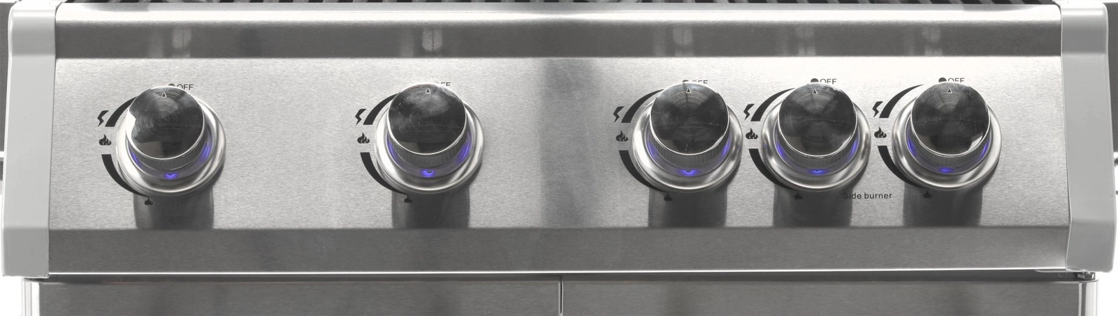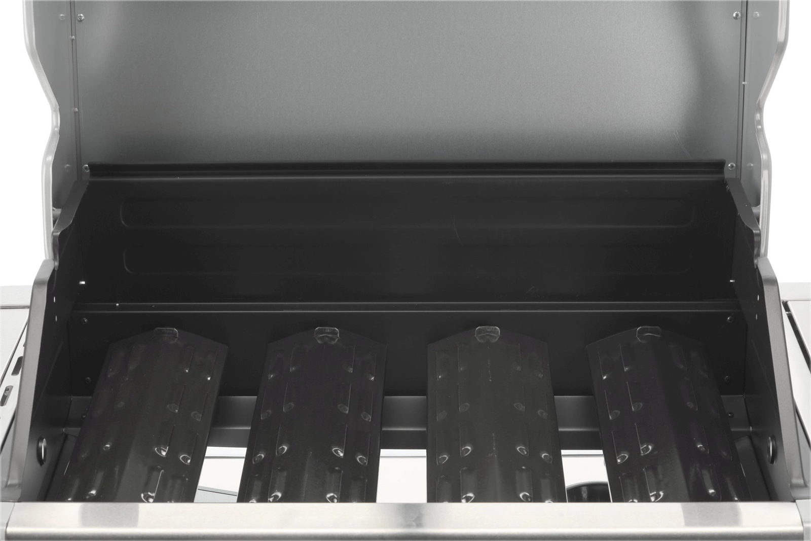 Zestaw 4+1 obejmuje 4 palniki główne ze stali nierdzewnej o mocy 3 kW każdy oraz 1 palnik boczny o mocy 2,2 kW, umożliwiający gotowanie i podgrzewanie potraw w garnku lub na patelni. Łączna moc wynosi 14,2 kW, przy średnim spalaniu gazu 1032 g/h. Średnica dyszy 4x0.8 + 1x0.7 mm. Praktyczność grillowania podkreślają półki boczne, pojemna szafka, osłona palnika (aromatyzer), stalowa misa odporna na wysoką temperaturę oraz obrotowe kółka z hamulcem ułatwiające transport. Dodatkowe udogodnienia to 6 wieszaków na półkach bocznych, 5 pokręteł z niebieskim światłem LED informujących o włączonych palnikach, otwieracz do butelek z boku grilla oraz możliwość wysunięcia płyty ściekowej i umycia jej poza grillem.