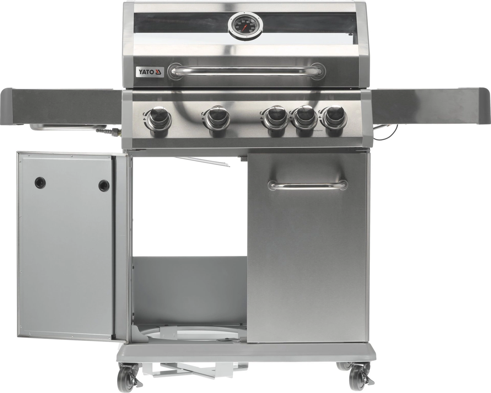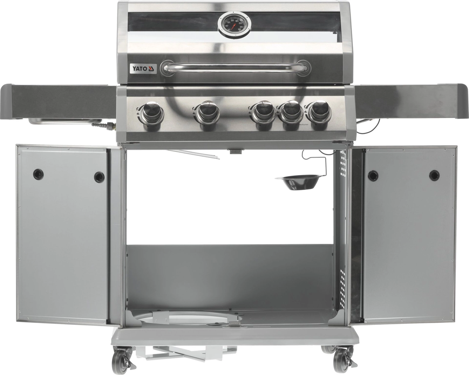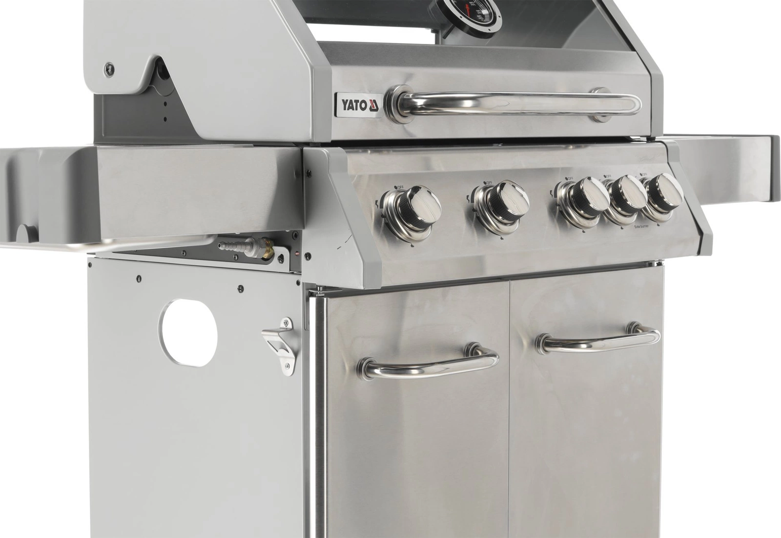 Grill Gazowy 4+1 marki YATO o wymiarach 133x57x112 cm wykonany z wysokiej jakości stali nierdzewnej. Centralnym elementem grilla jest szybko nagrzewalny żebrowy ruszt żeliwny o wymiarach 70x41,5 cm - 3 ruszty: 22,5x41,5 cm (2szt), 22x41,5cm (1szt), który długo utrzymuje ciepło. Dodatkowo, grill posiada wyjmowany okrągły ruszt o średnicy 30 cm, wbudowany w główny ruszt. Ten element można z łatwością zastąpić kamieniem do pizzy (brak w zestawie), co pozwala na rozszerzenie możliwości grilla. Wygoda użytkowania to także zasługa półek bocznych oraz pojemnej, zamykanej szafki, które ułatwiają przechowywanie niezbędnych akcesoriów, przypraw i innego wyposażenia. Dodatkowy palnik boczny o mocy 2,2 kW otwiera nowe możliwości, umożliwiając gotowanie i podgrzewanie potraw w garnku lub na patelni. Atutem jest miejsce na polską butlę gazową 11l, pojemnik ze stali nierdzewnej umieszczony w jednej z półek bocznych oraz wbudowany otwieracz do butelek.