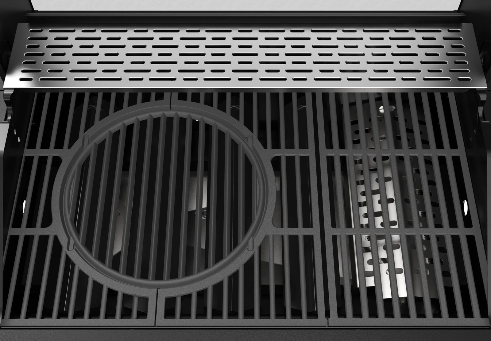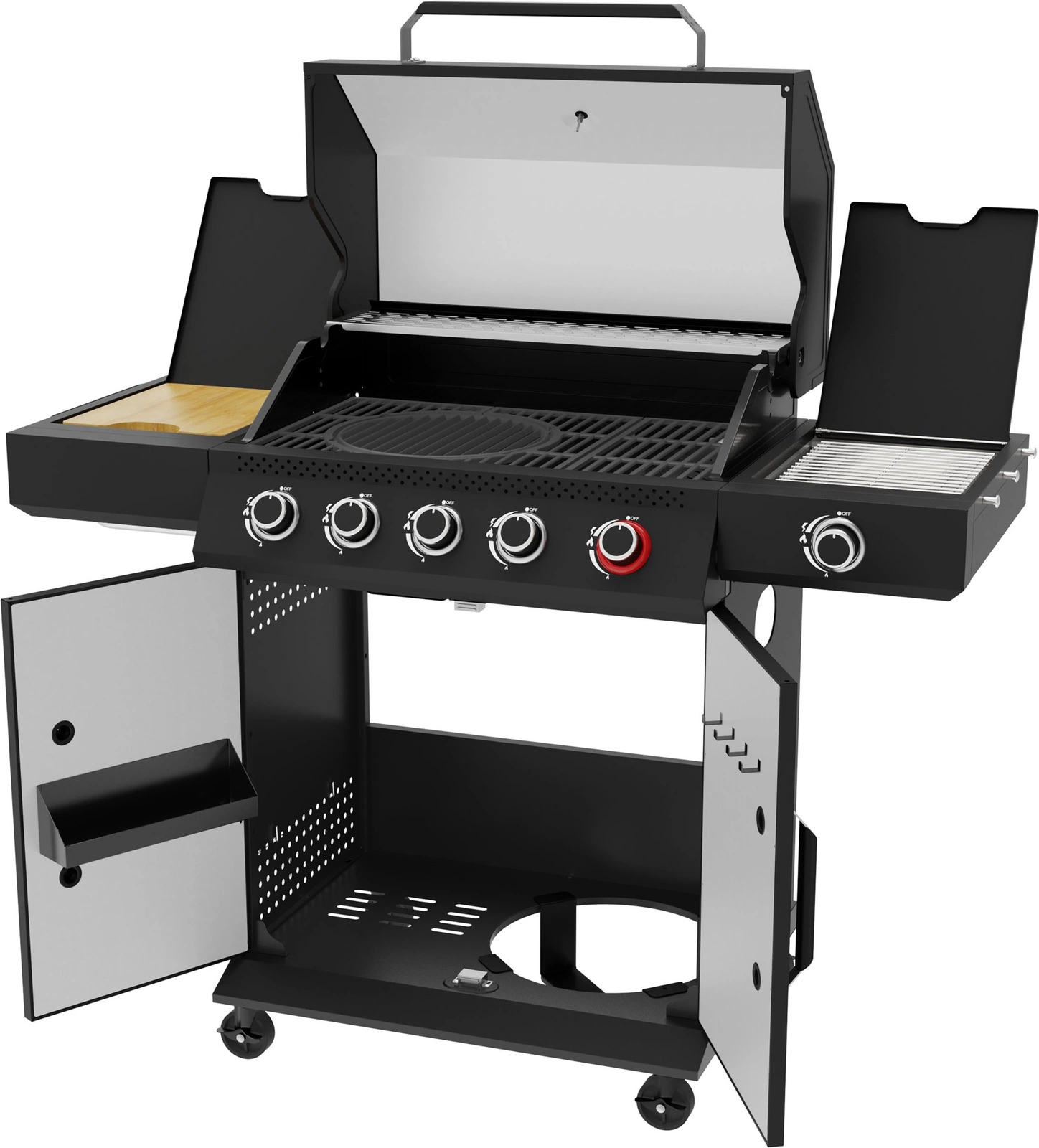 Grill posiada 5 głównych palników (4 × 3 kW + 1 × 4 kW) oraz boczny palnik infrared o mocy 3,5 kW, osiągający aż 800°C – idealny do szybkiego obsmażania mięs (tzw. sear). Dzięki automatycznemu zapalnikowi w pokrętłach, uruchomienie każdego palnika jest szybkie i bezpieczne. Dwuwarstwowa pokrywa ze stali nierdzewnej z termometrem umożliwia kontrolę temperatury i optymalną cyrkulację powietrza, nadając potrawom idealny smak i aromat.