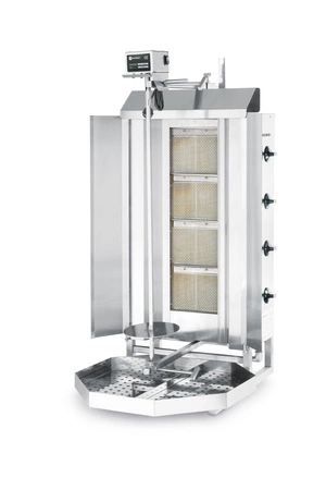 Pionowy opiekacz gazowy do gyrosa/kebaba wykonany ze stali nierdzewnej. Urządzenie przeznaczone do przyrządzania dużych sztuk mięsa, zwłaszcza specjalności kuchni greckiej – gyrosa. Opiekacz posiada wentyl bezpieczeństwa oraz szeroką powierzchnię grzewczą skracającą czas pieczenia mięsa. Na górze urządzenia znajduje się silnik z możliwością zmiany kierunku obrotów. Gyros posiada możliwość regulacji odległości rożna od elementów grzejnych.