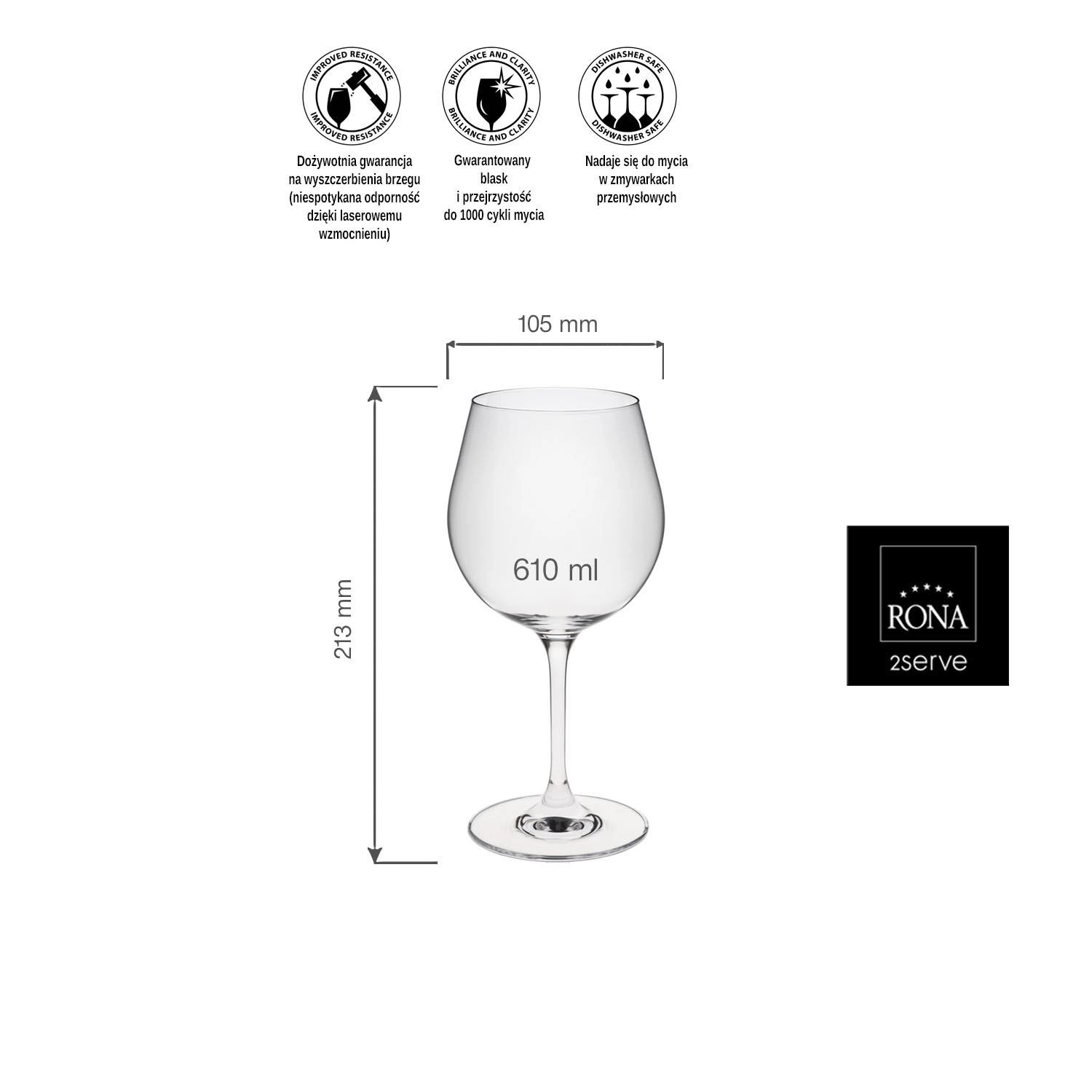 Kieliszek do wina Invitation o pojemności 610 ml. Wykonany ze sprężystego, niezwykle twardego szkła kryształowego, dzięki czemu jest zdecydowanie bardziej odporny na odpryski i uderzenia. Wytrzymałość na odpryski zwiększona o 50% w stosunku do standardowego wykończenia rantu. Bezspoinowe przejście od czaszy do nóżki zapewnia ekstremalną odporność na pękanie.