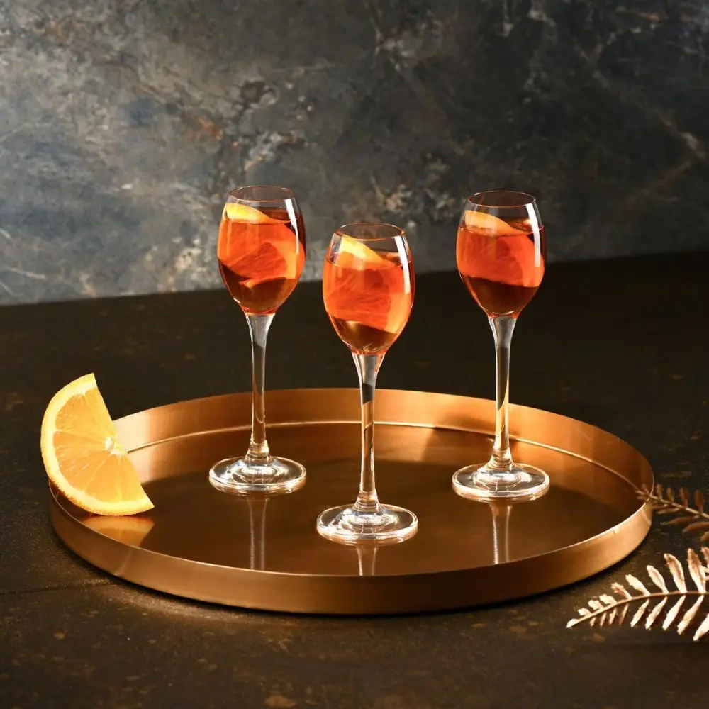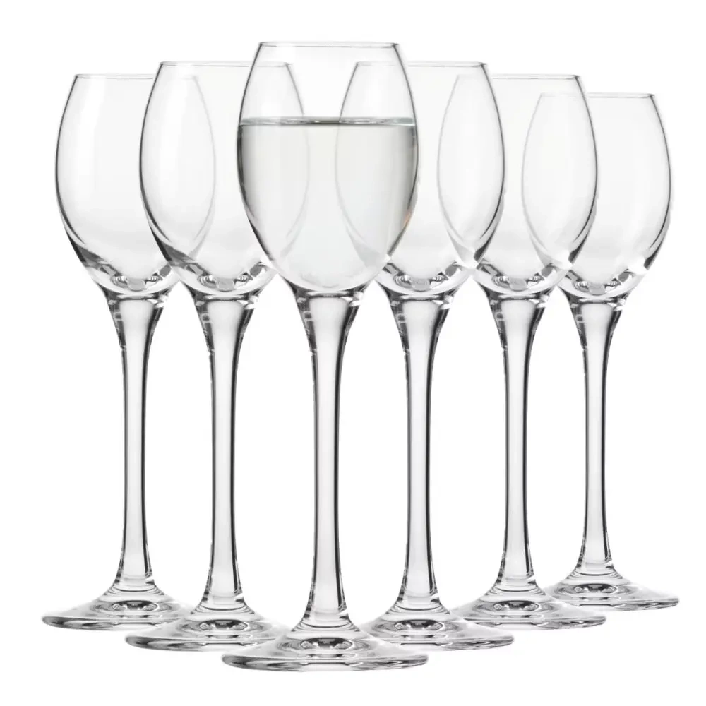 - Klasyczny, smukły kształt: Kieliszki posiadają tradycyjną czarkę z gładkim rantem, bezszwowo połączoną z prostą nóżką i stabilną stopką. Taka budowa nie tylko podkreśla elegancję, ale także ułatwia trzymanie i zapobiega nagrzewaniu się trunku.