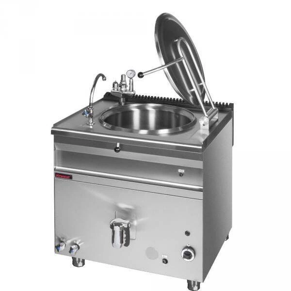 Grzanie pośrednie – kocioł posiada przestrzeń międzypłaszczową wypełnioną parą wodną, co znacząco przyspiesza proces gotowania i równomiernie rozprowadza ciepło, minimalizując ryzyko przypalenia potraw.