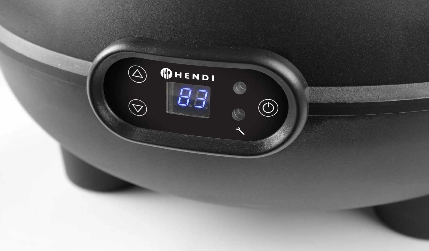 Kociołek jest wyposażony w cyfrowy panel sterujący z wyświetlaczem pokazującym na przemian temperaturę zadaną oraz temperaturę rzeczywistą zupy. Urządzenie posiada termostat zabezpieczający przed przegrzaniem - gdy poziom wody w pojemniku jest zbyt niski, zapala się czerwona lampka i włącza się alarm dźwiękowy.