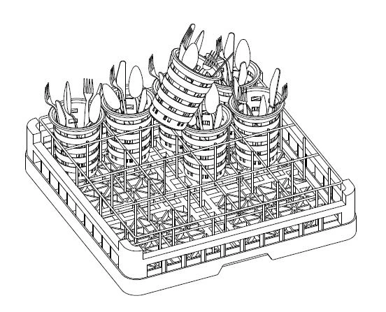 Kosz do sztućców PC 160 składa się z podstawy PB 100, wkładu PC 162 oraz 16 sztuk kubków PK2. Umożliwia skuteczne i bezpieczne mycie sztućców w zmywarce.