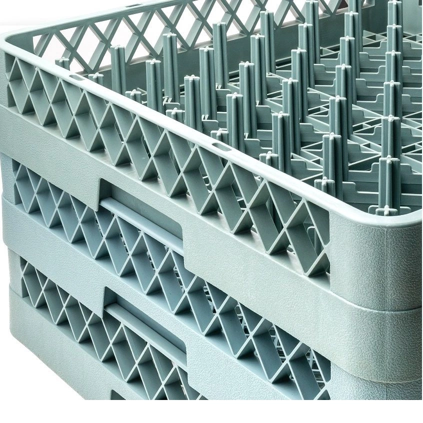 - Optymalny przepływ wody – Kratkowane dno oraz odpowiednio rozmieszczone przegrody gwarantują swobodny przepływ wody i detergentów, co przekłada się na skuteczne i równomierne czyszczenie naczyń.