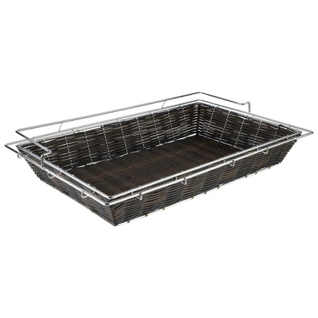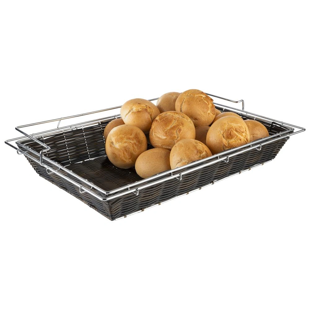 Produkt został wykonany z wytrzymałego polipropylenu, który jest odporny na uszkodzenia mechaniczne oraz łatwy w czyszczeniu. Dodatkowa rama ze stali nierdzewnej nadaje koszykowi stabilność i zapobiega jego przesuwaniu się po powierzchni. Dzięki prostokątnemu kształtowi koszyk łatwo ustawić w szeregu z innymi naczyniami na stole.