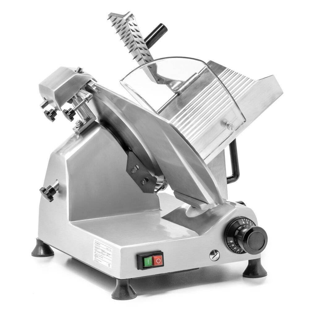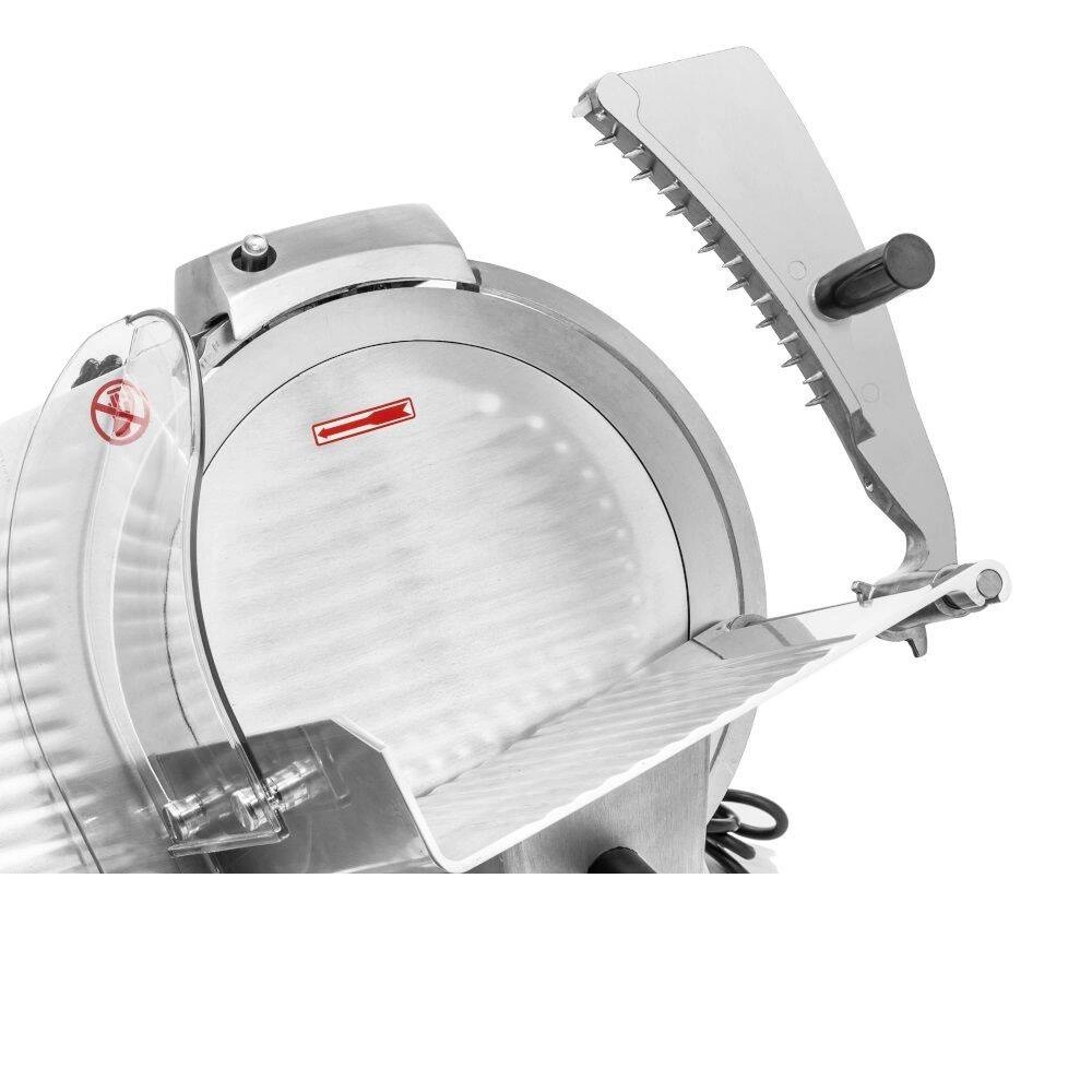 Duży, stalowy nóż o średnicy 30 cm to element, który wyróżnia tę krajalnicę na tle innych urządzeń dostępnych na rynku. Dzięki niemu możliwe jest precyzyjne i szybkie krojenie zarówno cienkich, jak i grubych plastrów wędlin, co jest szczególnie istotne w profesjonalnych kuchniach, sklepach mięsnych czy firmach cateringowych. Urządzenie doskonale radzi sobie nawet z twardszymi produktami, zapewniając równe i estetyczne plastry.