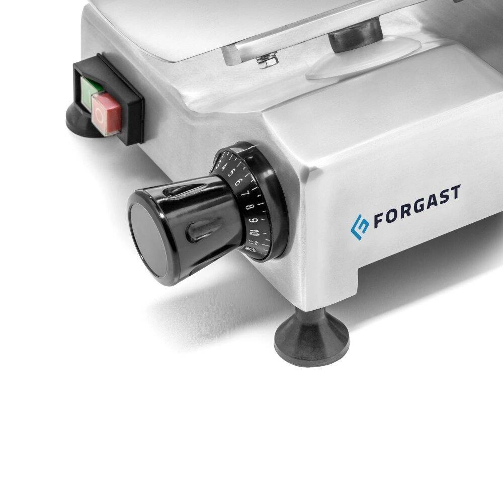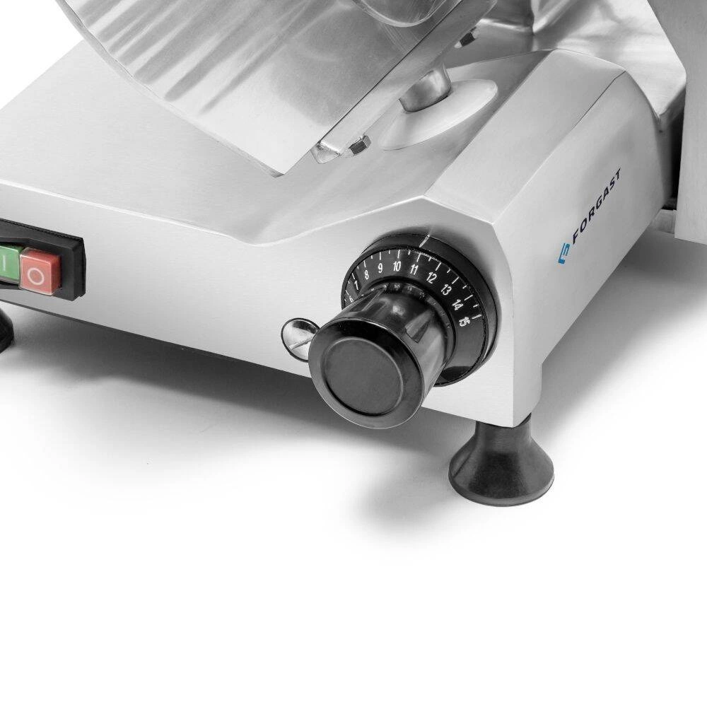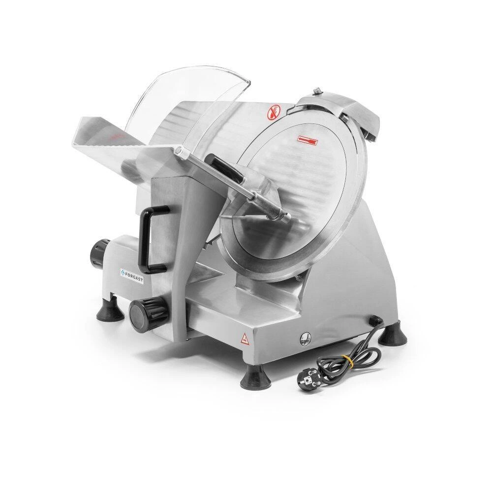 Krajalnica do wędlin marki FORGAST to profesjonalne urządzenie przeznaczone do precyzyjnego krojenia różnego rodzaju wędlin. Wyposażona w solidny nóż o średnicy 30 cm oraz silnik o mocy 0.25 kW, zapewnia wygodę i wydajność pracy w gastronomii. Idealnie sprawdzi się zarówno w restauracjach, sklepach mięsnych, jak i zakładach przetwórstwa spożywczego, umożliwiając szybkie i równomierne krojenie nawet dużych kawałków wędlin.