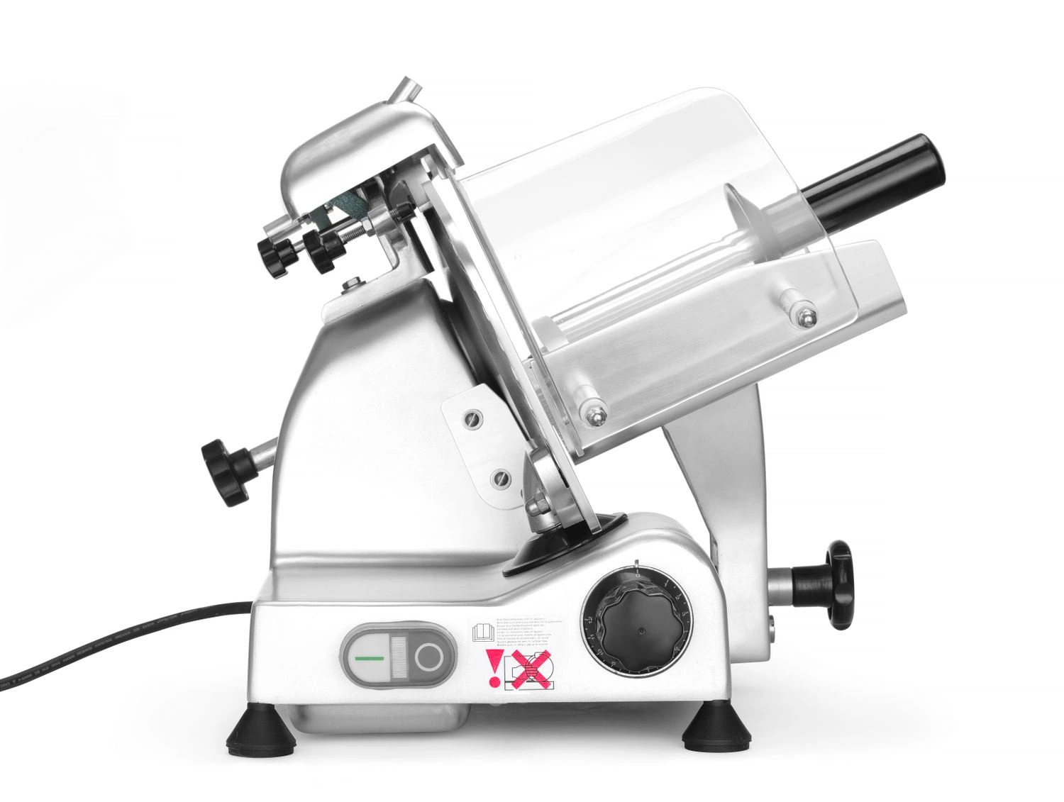 Profesjonalna krajalnica do wędlin i mięsa, przeznaczona do intensywnej eksploatacji w gastronomii, sklepach spożywczych czy masarniach. Urządzenie wyróżnia się solidną aluminiową konstrukcją, nożem ze stali nierdzewnej o średnicy 22 cm oraz szerokim zakresem regulacji grubości cięcia od cienkich plasterków do 12 mm.
