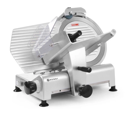 Aluminiowa krajalnica do wędlin i mięsa o średnicy noża 30 cm. Nóż wykonany ze stali nierdzewnej.
