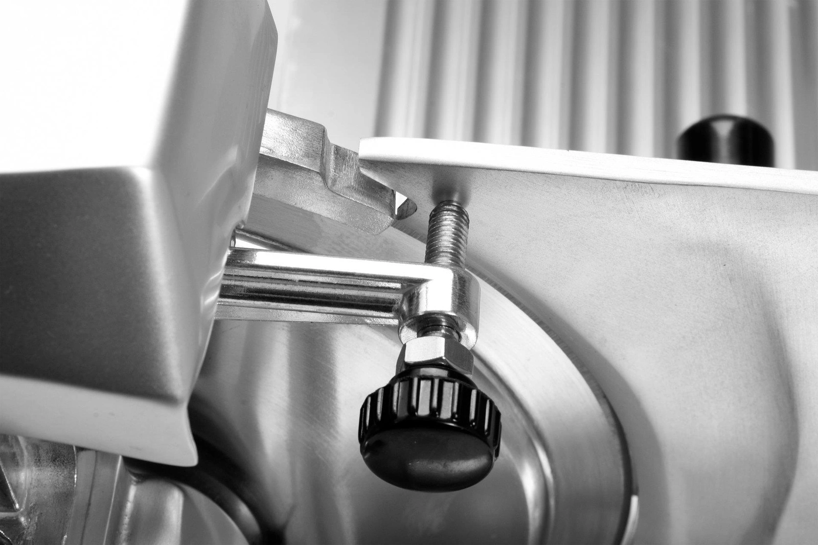 Wydajny silnik o mocy 150 W chłodzony powietrzem gwarantuje długą żywotność urządzenia, a prowadnice z łożyskami kulkowymi umożliwiają lekką i płynną pracę. Mechanizm tnący ustawiony jest pod kątem, co pozwala na grawitacyjne dociskanie produktów do tarczy.