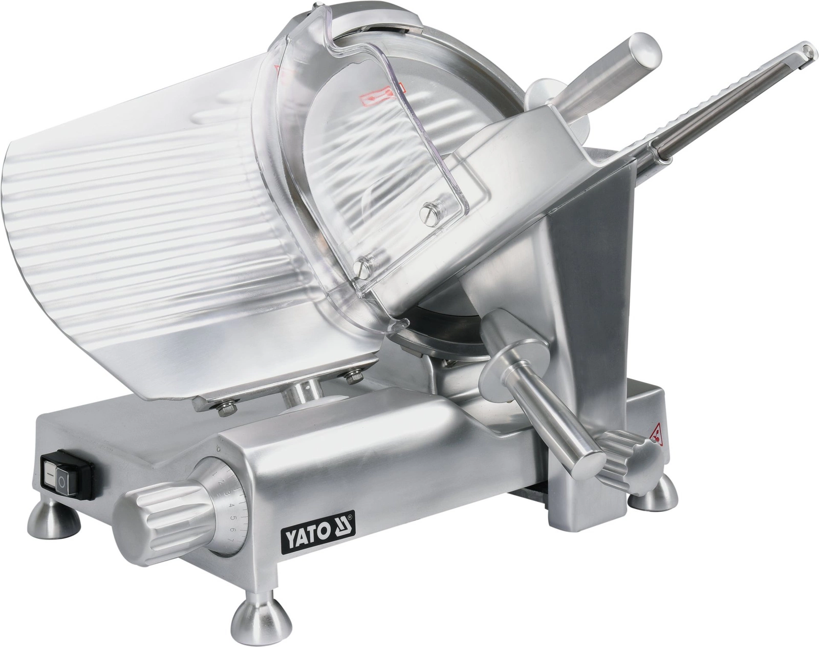 Krajalnica do wędlin marki YATO o średnicy noża 30 cm. Podstawa krajalnicy wykonana z wysokiej jakości stopu aluminium z lakierowaną powierzchnią w kolorze szarym ułatwia utrzymanie w czystości urządzenia. Dodatkowo, demontowalny wózek sprawia, że dostęp do trudno dostępnych miejsc jest łatwy, co pozwala na dokładne czyszczenie maszyny z resztek krojonych produktów. Tarcza tnąca o średnicy 30 cm umożliwia precyzyjne krojenie produktów o średnicy sięgającej do 20 cm. Dzięki płynnej regulacji grubości krojenia, możliwe jest uzyskanie plastrów o grubości od 0,2 do 15 mm, dostosowując się do różnorodnych potrzeb kuchni. Maksymalna szerokość ciętego produktu wynosi 18 cm, natomiast maksymalna średnica dla ciętego produktu to 20 cm. Silnik chłodzony powietrzem o mocy 250 W nie tylko zapobiega przeciążeniom, ale także gwarantuje wysoką wydajność i długą żywotność maszyny. Wózek zainstalowany na prowadnicach z łożyskami pracuje lekko i płynnie, co znacznie redukuje wysiłek podczas cięcia. Dodatkowo, ukośne ustawienie mechanizmu tnącego umożliwia grawitacyjne dociskanie krojonych produktów do tarczy, co jeszcze bardziej usprawnia proces.