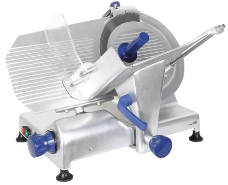 Opływowy korpus ułatwia utrzymanie urządzenia w czystości, a odpowiednio pochylony stół roboczy oraz wyprofilowana płyta dociskowa zapewniają stabilne i bezpieczne krojenie. Ergonomiczny uchwyt stołu umożliwia wygodną obsługę, nawet przy intensywnym użytkowaniu. Integralna ostrzarka umożliwia utrzymanie noża w optymalnej ostrości.