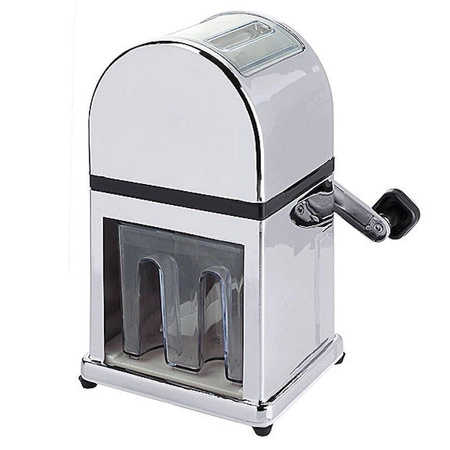 Obudowa kruszarki wykonana jest z trwałego, chromowanego materiału, który nie tylko dobrze się prezentuje, ale także zapewnia długą żywotność produktu. Przezroczysty pojemnik z akrylu pozwala na bieżąco obserwować ilość przygotowanego lodu. Do zestawu dołączona jest praktyczna plastikowa szufelka, która ułatwia nakładanie lodu do szklanek lub pojemników.