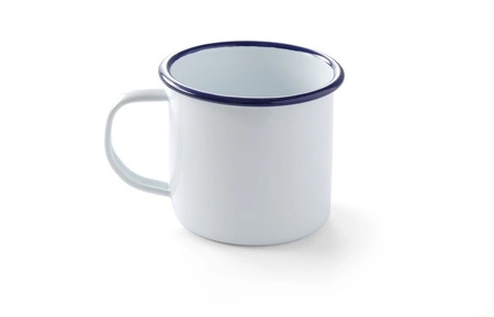 Kubek z uchwytem o pojemności 360 ml. Wykonany z wysokiej jakości stali pokrytej białą emalią z niebieskim brzegiem. Możliwość piętrowania, Można myć w zmywarkach. Nie należy używać w kuchenkach mikrofalowych.