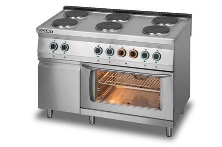 Kuchnia gastronomiczna elektryczna 6-płytowa z piekarnikiem elektrycznym z termoobiegiem, GN 1/1 i z szafką LOZAMET L700.KEO6 PET+SD